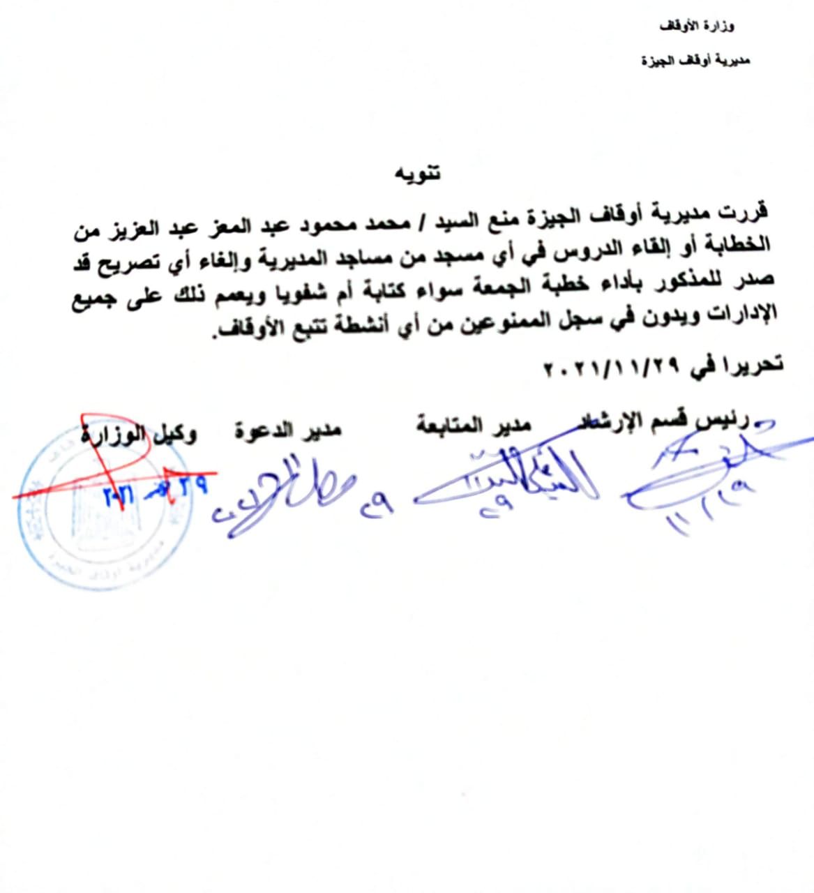 الأوقاف تفصل خطيبًا في مديرية الجيزة | مستند