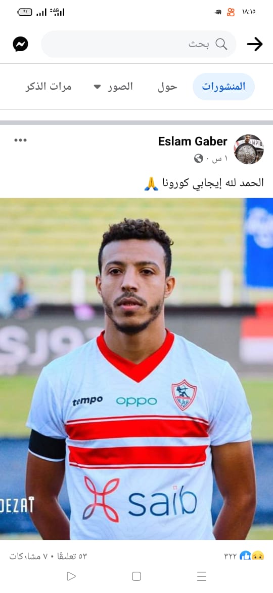 ونشر اللاعب عبر صفحته الشخصية بموقع التواصل الاجتماعي فيس بوك صورة له وكتب: "الحمد لله إيجابي كورونا".
