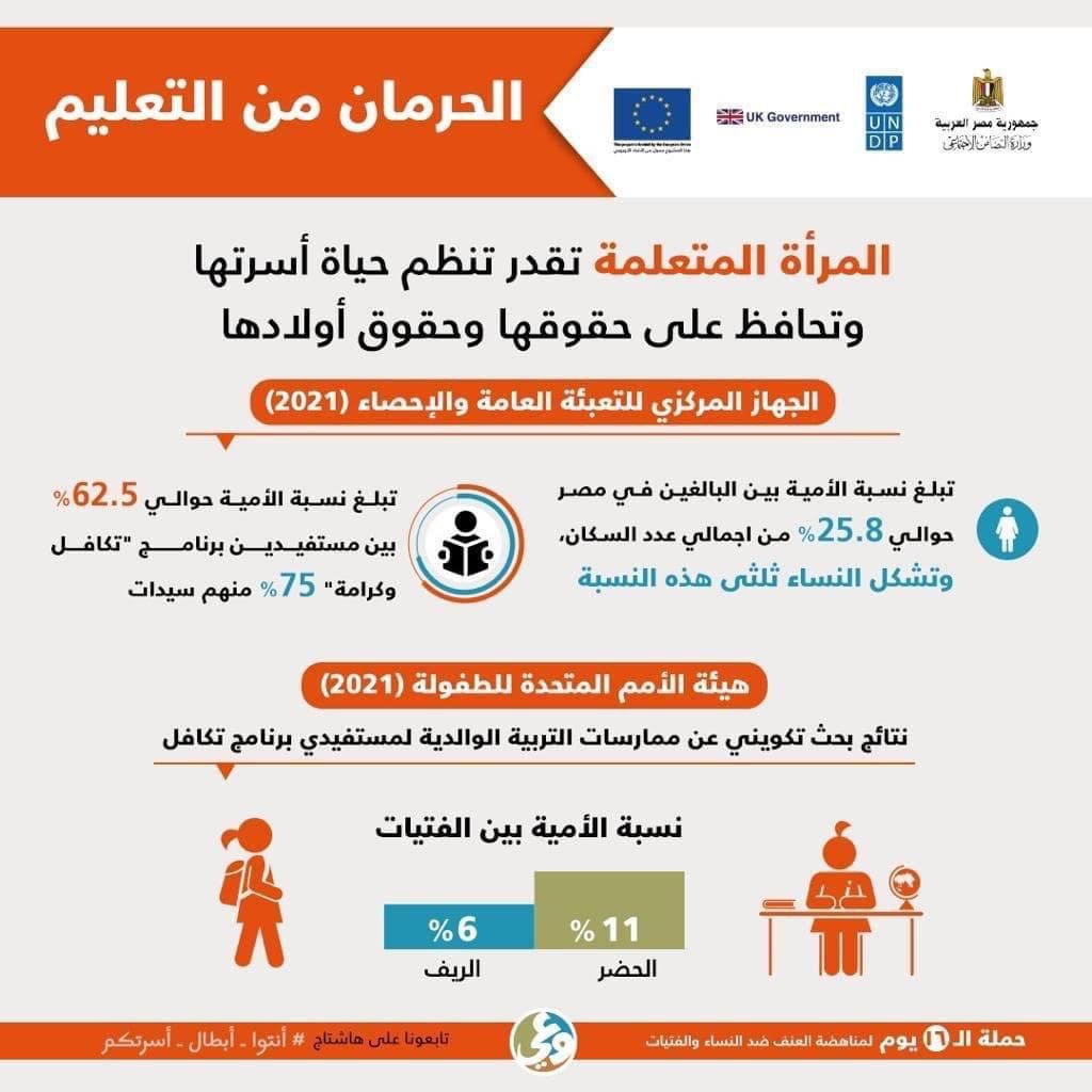 ونشرت الصفحة الرسمية لوزارة التضامن الاجتماعي، على موقع التواصل الاجتماعي «فيس بوك»، أرقامًا عن تعليم الإناث في مصر، كاشفة أن نسبة الأمية بين البالغين في مصر تبلغ نحو 25.8 % من اجمالي عدد السكان، تشكل النساء ثلثي هذه النسبة، وذلك وفقًا لإحصائية الجهاز المركزي للتعبئة والإحصاء 2021، متابعة أن نسبة الأمية بين مستفيدي برنامج الدعم النقدي تكافل وكرامة وصلت إلى 62.5 %، ونحو 75 % من هذه النسبة سيدات.