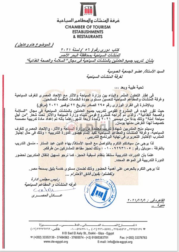 وأوضح قرار المشروع القومي لتدريب جميع العاملين بالمنشآت السياحية في مجال السلامة والصحة الغذائية، أنه تم إعداد مادة تدريبية مصممة خصيصًا لهذا الغرض مدتها يومان، وسيتم منح المتدربين شهادة تدريب معتمدة من وزارة السياحة والآثار، والاتحاد المصري للغرف السياحية، وغرفة المنشآت والمطاعم السياحية تفيد إتمام حضور الدورة التدريبية، وذلك في حال اجتياز المتدرب الاختبار التحريري في نهاية البرنامج التدريبي.