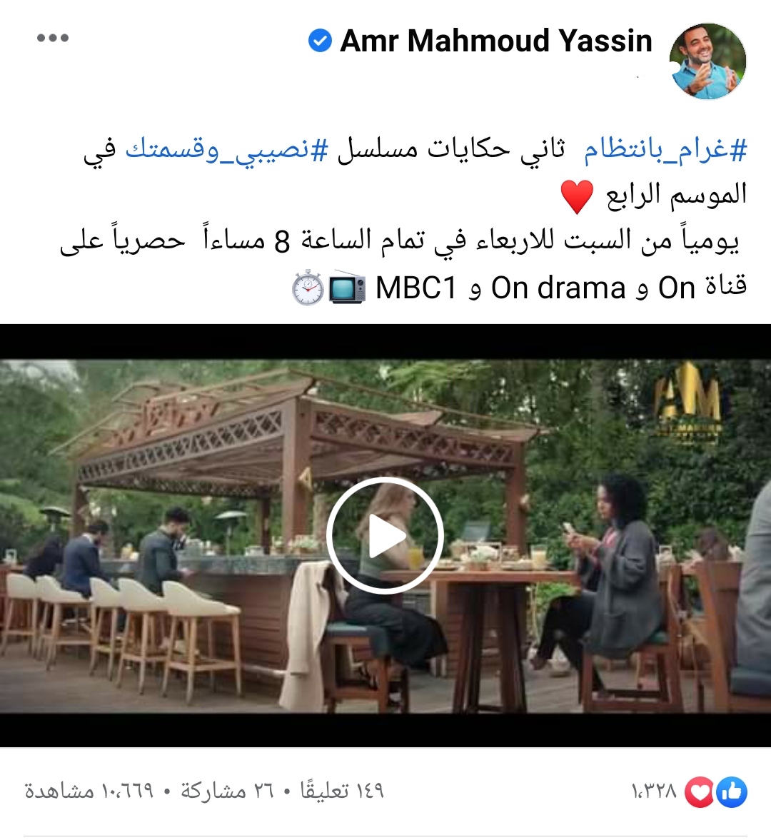 وروج عمرو محمود ياسين لحكاية غرام بانتظام من قبل، حيث كتب منشورًا عبر حسابه الشخصي بموقع التواصل الاجتماعي فيس بوك، قال فيه: غرام بانتظام ثاني حكايات مسلسل مسلسل نصيبي وقسمتك، في الموسم الرابع، يوميًا من السبت للأربعاء في تمام الساعة 8 مساءً، حصريًا على قناة On وOn drama وMBC1.