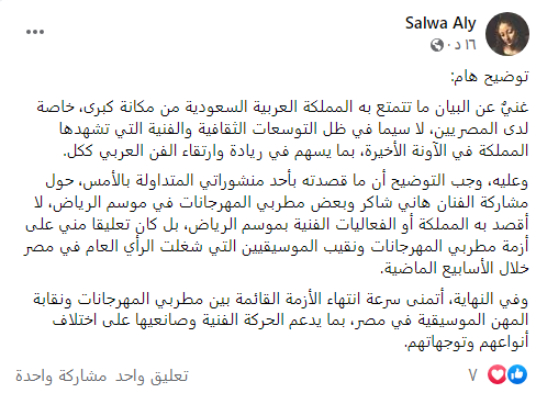 وتابعت سلوى محمد علي: وعليه وجب التوضيح أن ما قصدته بأحد منشوراتي المتداولة أمس، حول مشاركة الفنان هاني شاكر، وبعض مطربي المهرجانات في موسم الرياض، لا أقصد به المملكة أو الفعاليات الفنية بموسم الرياض، بل كان تعليقا مني على أزمة مطربي المهرجانات ونقيب الموسيقيين، التي شغلت الرأي العام في مصر خلال الأسابيع الماضية.