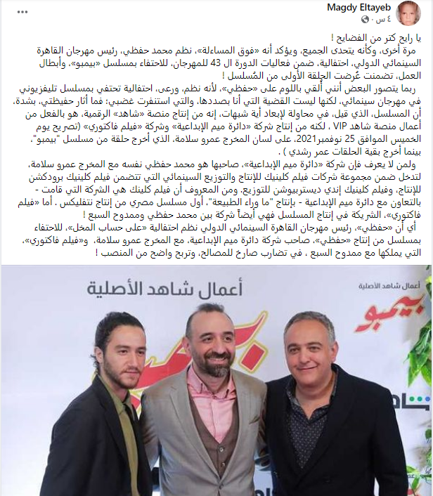 وكتب مجدي الطيب عبر حسابه الشخصي على فيسبوك، الآتي: يا رايح كتر من الفضايح! مرة أخرى، وكأنه يتحدى الجميع، ويؤكد أنه فوق المساءلة، نظم محمد حفظي، رئيس مهرجان القاهرة السينمائي الدولي، احتفالية، ضمن فعاليات الدورة الـ43 للمهرجان، للاحتفاء بمسلسل بيمبو، وأبطال العمل، تضمنت عُرضت الحلقة الأولى من المُسلسل!