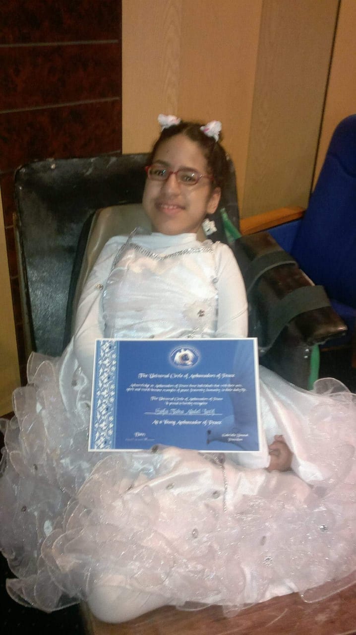 أوضحت صفاء طه، أنها تبلغ من العمر 18 سنة، ومصابة بتيبس في المفاصل واعوجاج في العمود الفقري، منذ الولادة، وحاليًا تدرس في الصف الثالث الثانوي.