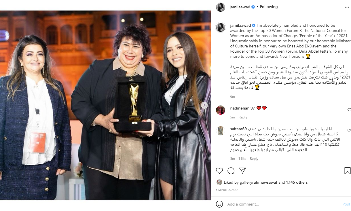 ونشرت جميلة عوض، صورة من الاحتفالية، عبر حسابها الشخصي بموقع تبادل الصور والفيديوهات القصيرة انستجرام، وكتبت قائلة: لي كل الشرف والفخر لاختياري وتكريمي من منتدى قمة الخمسين سيدة والمجلس القومي للمرأة لأكون سفيرة التغيير ومن ضمن شخصيات العام 2021.