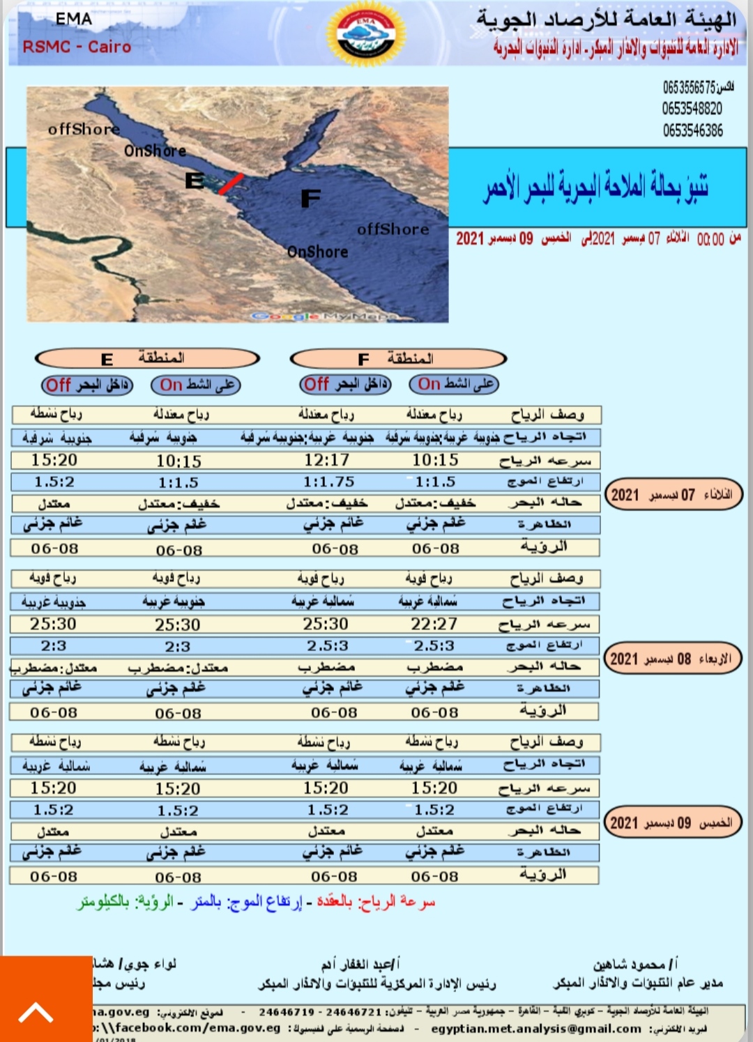 وتنتقل حالة اضطراب حركة الملاحة البحرية بالبحر المتوسط إلى مسطح البحر الأحمر يوم الأربعاء، فيكون بين معتدل إلى مضطرب، مع نشاط رياح قوية جنوبية غربية وشمالية غربية تصل سرعتها إلى 30 كم، كما تتراوح الأمواج بين 2.5: 3 أمتار، وينحسر مستوى الرؤية الأفقية بين 6: 8 كم.