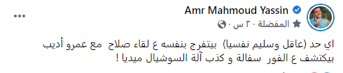 وكتب السيناريست عمرو محمود ياسين عبر حسابه الرسمي بموقع التواصل الاجتماعي فيس بوك: أي حد عاقل وسليم نفسيًا، بيتفرج بنفسه على لقاء محمد صلاح مع عمرو أديب، بيكتشف على الفور سفالة وكذب آلة السوشيال ميديا.