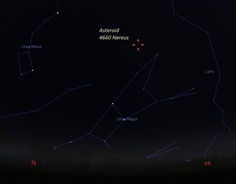 تابع شاكر، أن الكويكب نيريوس لا يرى بالعين المجردة حيث يكون لمعانه بقدر 12 وهذا خافت جدا بالنسبة للعين، قائلًا: لرؤية نيريوس، تحتاج إلى تليسكوب 8 بوصات (20 سم) أو أكبر.