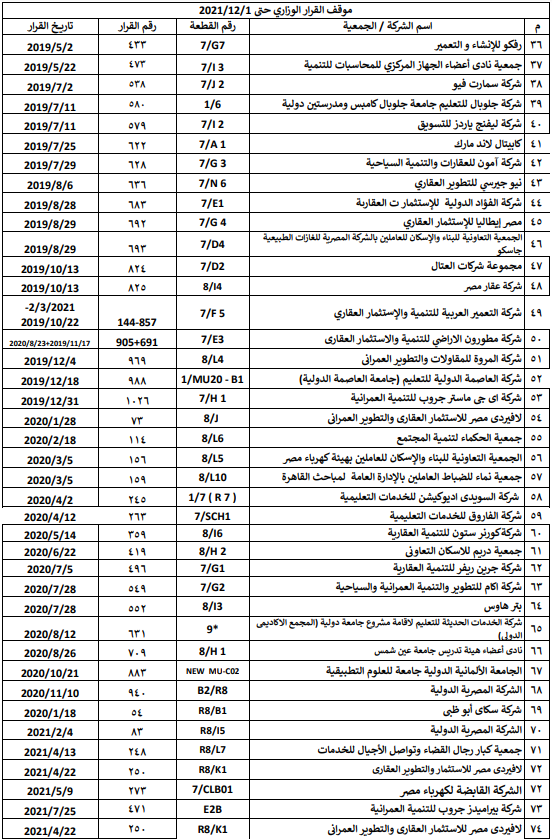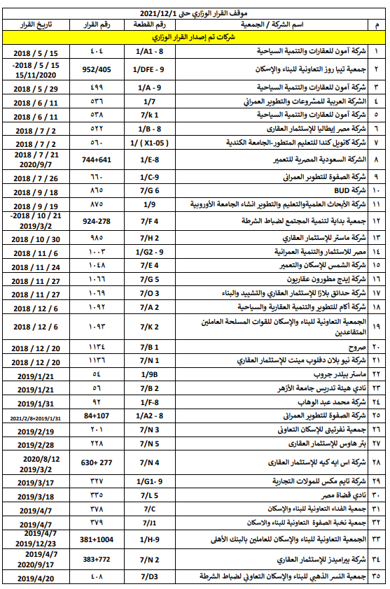 أعلنت شركة العاصمة الإدارية للتنمية العمرانية، بالتعاون مع وزارة الإسكان ممثل في شئون التخطيط والمتابعة، الشركات الحاصلة على أراضٍ وتراخيص بناء بالعاصمة حتى تاريخ 1/12/2021، والتي قُدر عددها بناء لنحو 74 شركة وجمعية، بمساحات متنوعة.