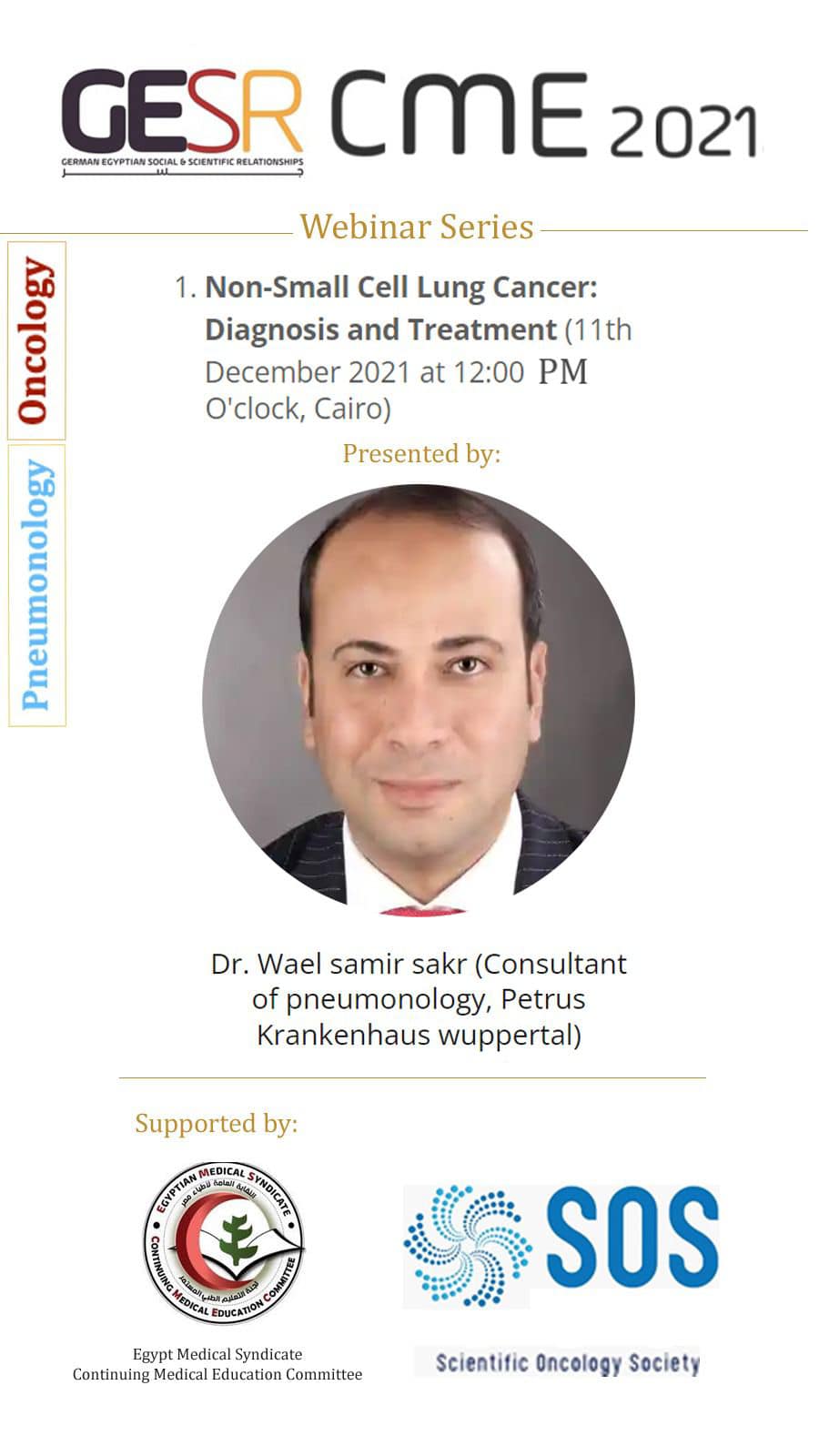 3-تشخيص وعلاج أورام الرئة من النوع NSCLC: السبت 11 ديسمبر 12 ظهرا بتوقيت القاهرة، الدكتور سمير صقر، استشاري بقسم أمراض الرئة بفوبرتال- ألمانيا.