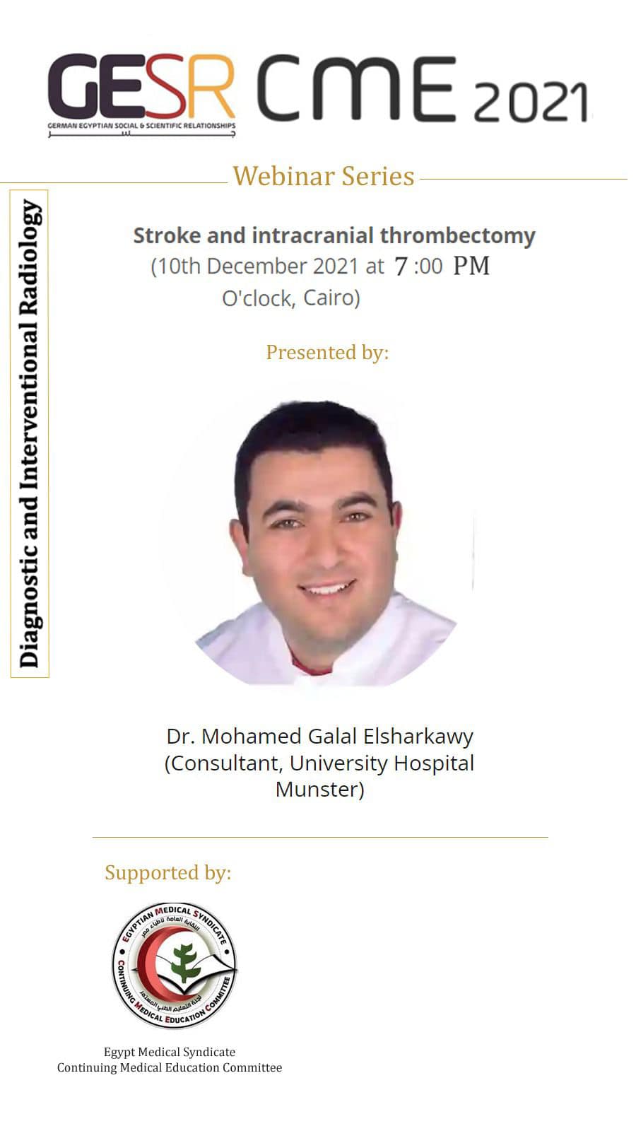 2-العلاجات التداخلية للسكتة الدماغية: الجمعة الموافق 10 ديسمبر 7 مساء بتوقيت القاهرة، الدكتور محمد جلال الشرقاوي، استشاري الأشعة التداخلية بمستشفى مونستر الجامعي في ألمانيا.