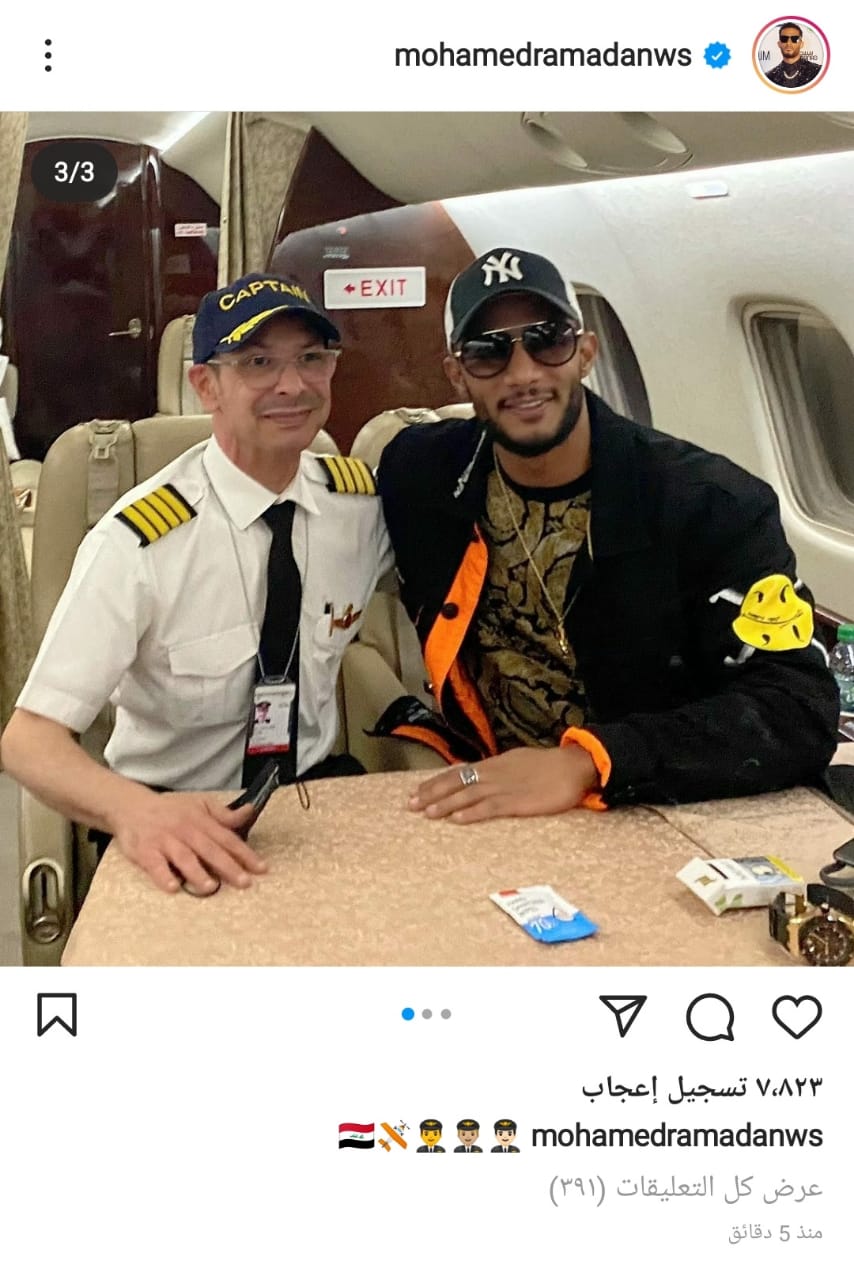 وشارك محمد رمضان جمهوره، ببعض الصور من داخل الطائرة، وذلك عبر حسابه الشخصي بموقع تبادل الصور والفيديوهات إنستجرام، ظهر فيها برفقة ثلاثة من قائدي الطائرة الخاصة به.
