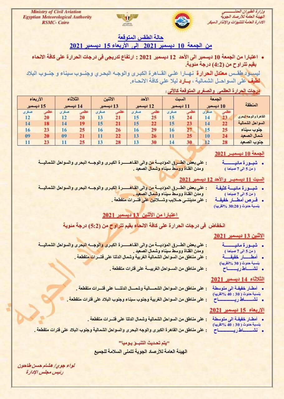 وأكدت هيئة الأرصاد الجوية أنه سيسود خلال الأسبوع المقبل طقس معتدل الحرارة نهارا على القاهرة الكبرى، والوجه البحري، وجنوب سيناء، وجنوب البلاد، لطيف على السواحل الشمالية، فيما يسود طقس بارد ليلا على كافة الأنحاء.