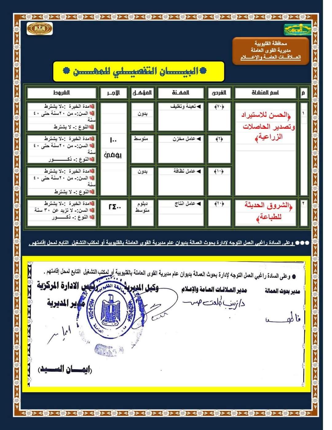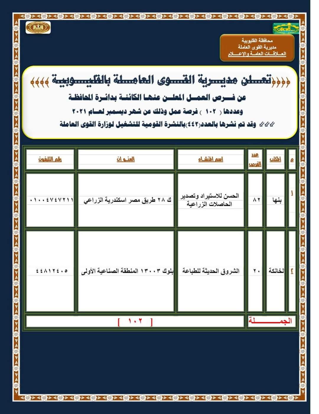 أعلنت مديرية القوى العاملة فى القليوبية، بقيادة إيمان شحاتة مدير المديرية، عن توفير 102 فرصة عمل فى شركات، برواتب مجزية طبقا للخبرات المطلوبة لبعض المهن.