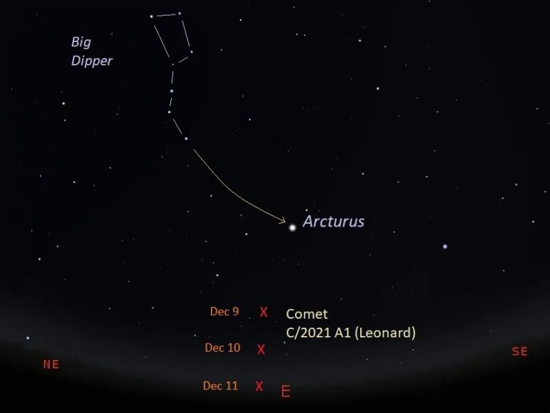 مايزال ليونارد (C / 2021 A1) ألمع مذنب لهذا العام 2021، يتم رصده باتجاه الأفق الشرقي خلال ساعات قبل شروق الشمس، ووصل لمعانه إلى القدر السادس وهذا يجعله بالكاد مرئيًا بالعين المجردة لكنه هدف سهل للكاميرات الرقمية.