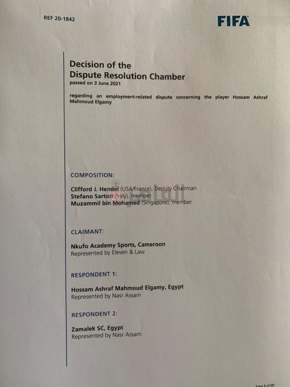 البند رقم 1- في31 ديسمبر 2017 وقع اللاعب حسام اشرف (المشكو في حقه الأول) مع نادي الزمالك المصري (المشكو في حقه الثاني) عقد حتى 30 يونيو 2020