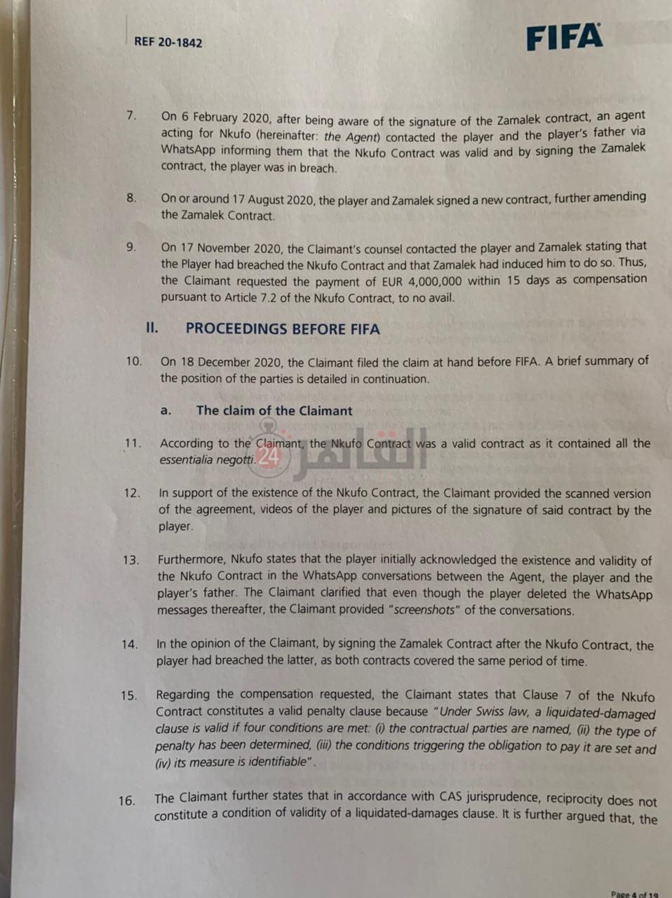 البند رقم 7 - في 6 فبراير 2020 وبعد العلم بتوقيع اللاعب عقد مع نادي الزمالك اجري وكيل الاكاديمية الكاميرونية اتصال باللاعب ووالد اللاعب من خلال تطبيق واتساب لإخطارهم بأنه بموجب تفعيل العقد الموقع بين اللاعب والأكاديمية الكاميرونية فان توقيع اللاعب لنادي الزمالك يضع اللاعب في مخالفة التوقيع لناديين.