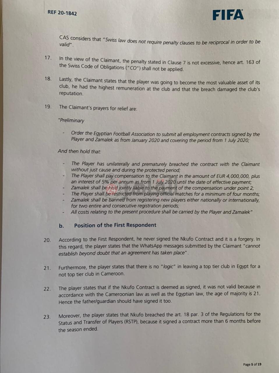 البند رقم 10 - في 18 ديسمبر 2020 تقدمت الاكاديمية الكاميرونية بشكوى إلى الفيفا تختصم اللاعب ونادي الزمالك.