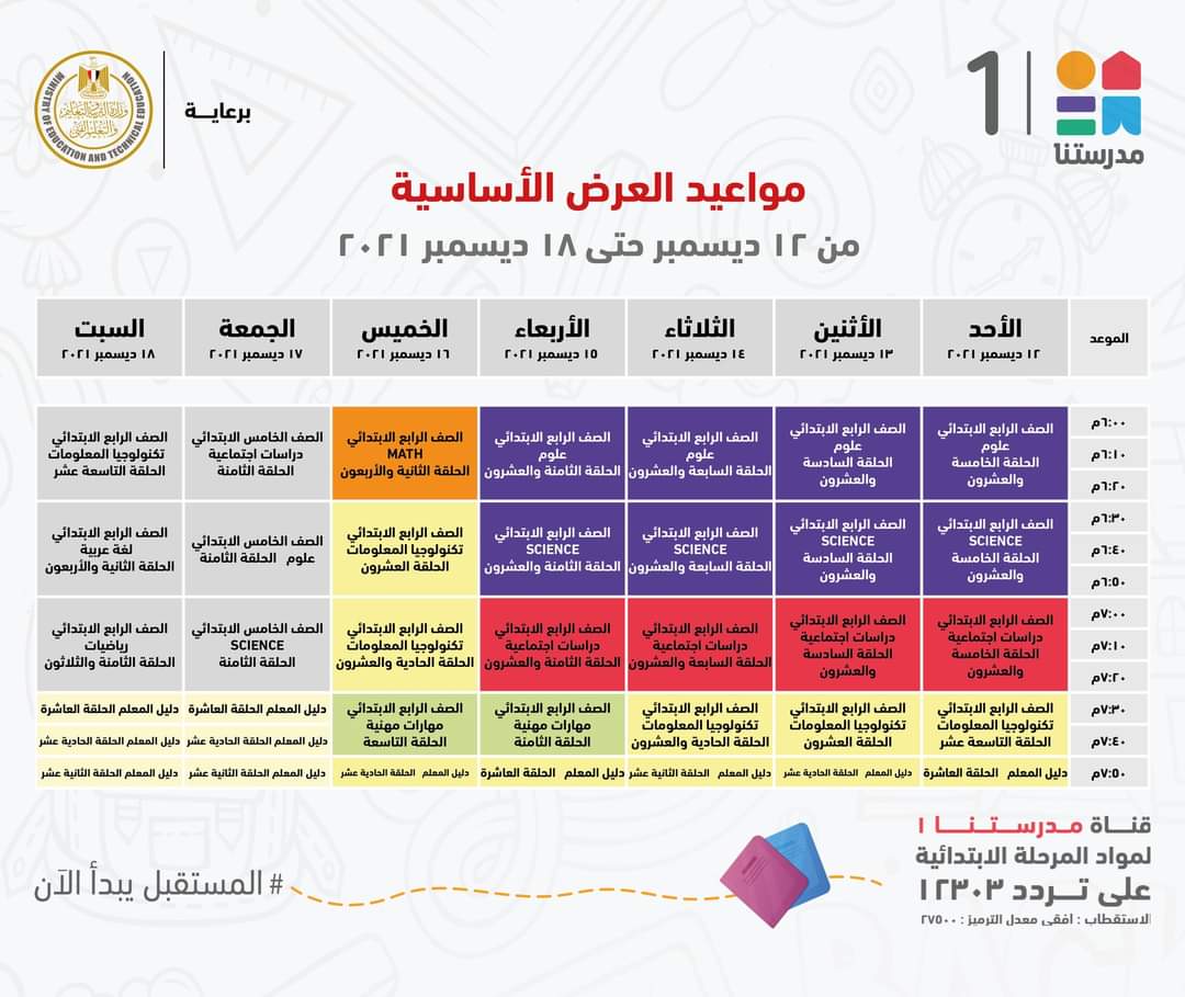 أعلنت قناة مدرستنا 1 التابعة لوزارة التربية والتعليم، للطلاب وأولياء أمور عن مواعيد عرض البرامج التعليمية للصفوف الابتدائية، باللغة العربية مع الإعادة، على قناة مدرستنا 1 من تاريخ 12-18 ديسمبر، مشيرة أنه يمكن المتابعة على التردد 12303 الاتي.