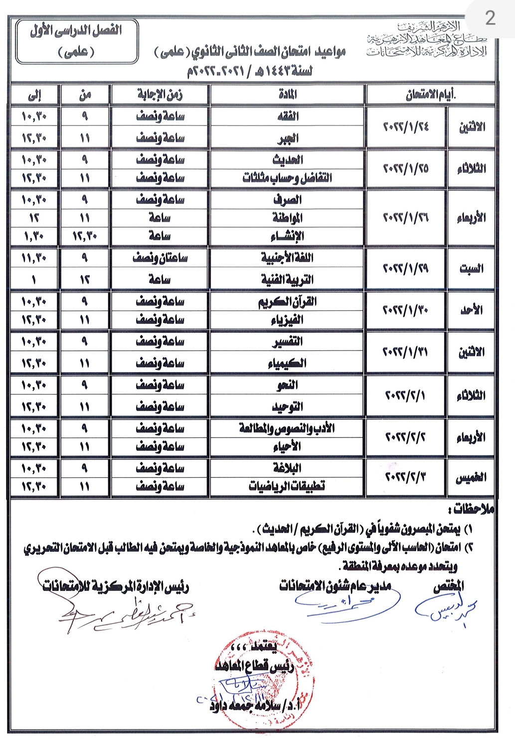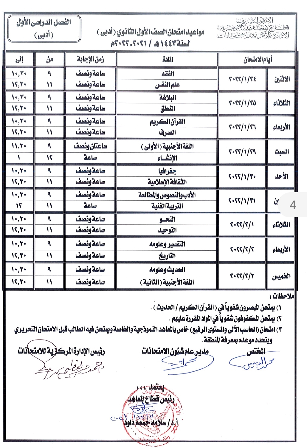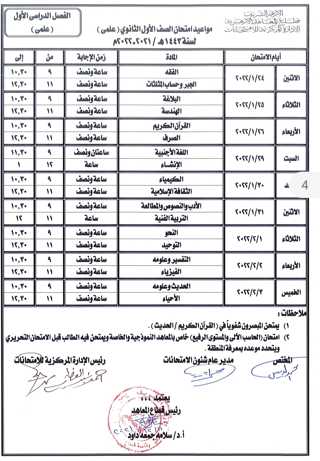 وحدد قطاع المعاهد الأزهرية موعد بدء امتحانات الصف الأول الثانوي الأزهري علمي وأدبي، وامتحانات الصف الثاني الثانوي علمي وأدبي، يوم الإثنين الموافق 24 / 1 / 2022 وتنتهي يوم الخميس الموافق 3 / 2 / 2022.
