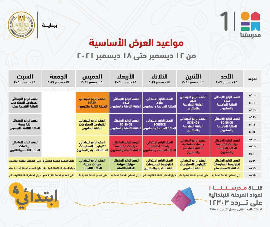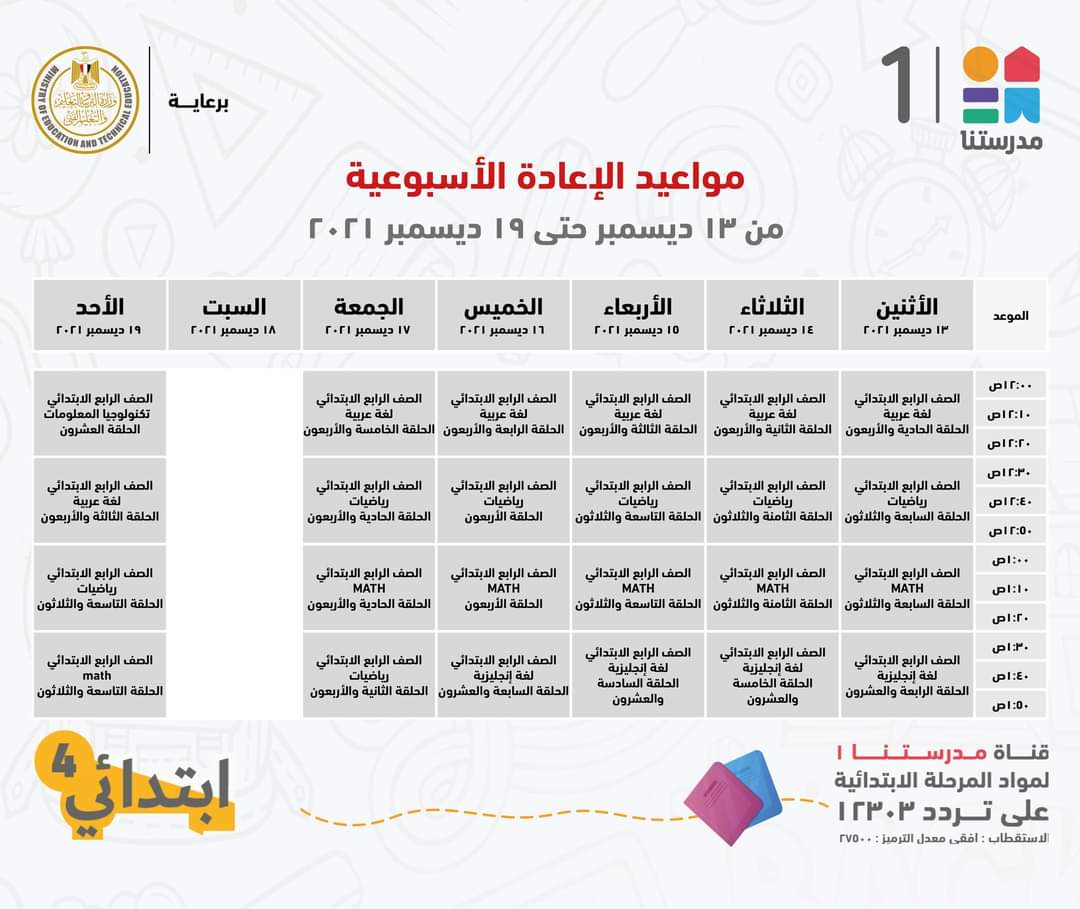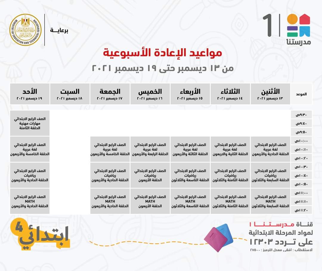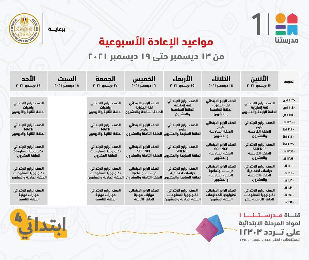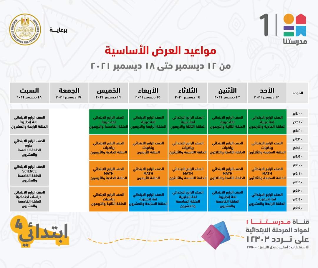 أعلنت قناة مدرستنا 1، التابعة لوزارة التربية والتعليم والتعليم الفني، الجدول الخاص بالصف الرابع الابتدائي مع الإعادة.