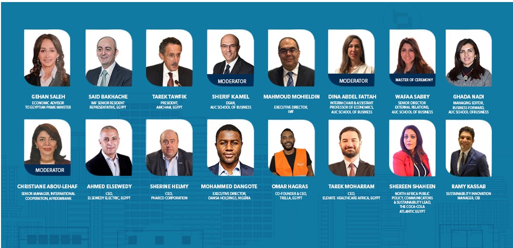 وسيكون من ضمن المتحدثين ممثلين عن الحكومة والمؤسسات الدولية والقطاع الخاص منهم، جيهان صالح المستشار الاقتصادي لرئيس مجلس الوزراء، والدكتور محمود محيي الدين ممثل مصر والمجموعة العربية في صندوق النقد الدولي، وأحمد السويدي الرئيس التنفيذي لمجموعة السويدي إلكتريك، وكريستين أبو لحاف رئيس قطاع التعاون الدولي في البنك الإفريقي للتصدير والاستيراد أفركسيم بنك، ومحمد دانجوت المدير التنفيذي لشركة دانسا القابضة المحدودة، وسعيد بخاش، كبير ممثلي صندوق النقد الدولي في مصر، وعمر هجرس المدير التنفيذي لشركة تريلا، وطارق توفيق رئيس غرفة التجارة الأمريكية بمصر، والدكتور شيرين حلمي الرئيس التنفيذي للقطاع التجاري بشركة فاركو للأدوية، والدكتور طارق محرم رئيس مجلس إدارة شركة إليفيت للرعاية الطبية والرئيس التنفيذي لمركز النيل، وشيرين شاهين، مدير الاستدامة والشئون الحكومية والعلاقات العامة بشركة كوكاكولا مصر، والدكتور شريف كامل، عميد كلية إدارة الأعمال بالجامعة الأمريكية بالقاهرة.