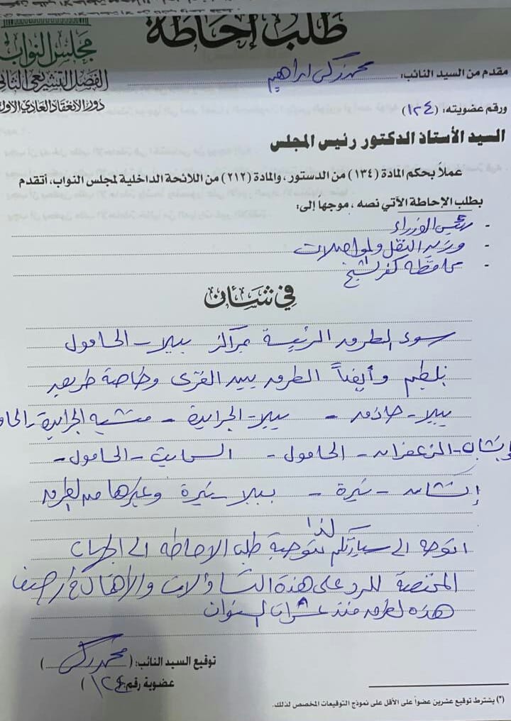 تقدم النائب محمد زكي إبراهيم، عضو مجلس النواب عن دائرة الحامول وبلطيم وبيلا، بـ محافظة كفر الشيخ، بطلب إحاطة للدكتور مصطفى مدبولي، رئيس مجلس الوزراء، وكذلك الفريق كامل الوزير، وزير النقل والمواصلات، واللواء جمال نور الدين، محافظ كفر الشيخ، بشأن سوء حالة عدد من الطرق.