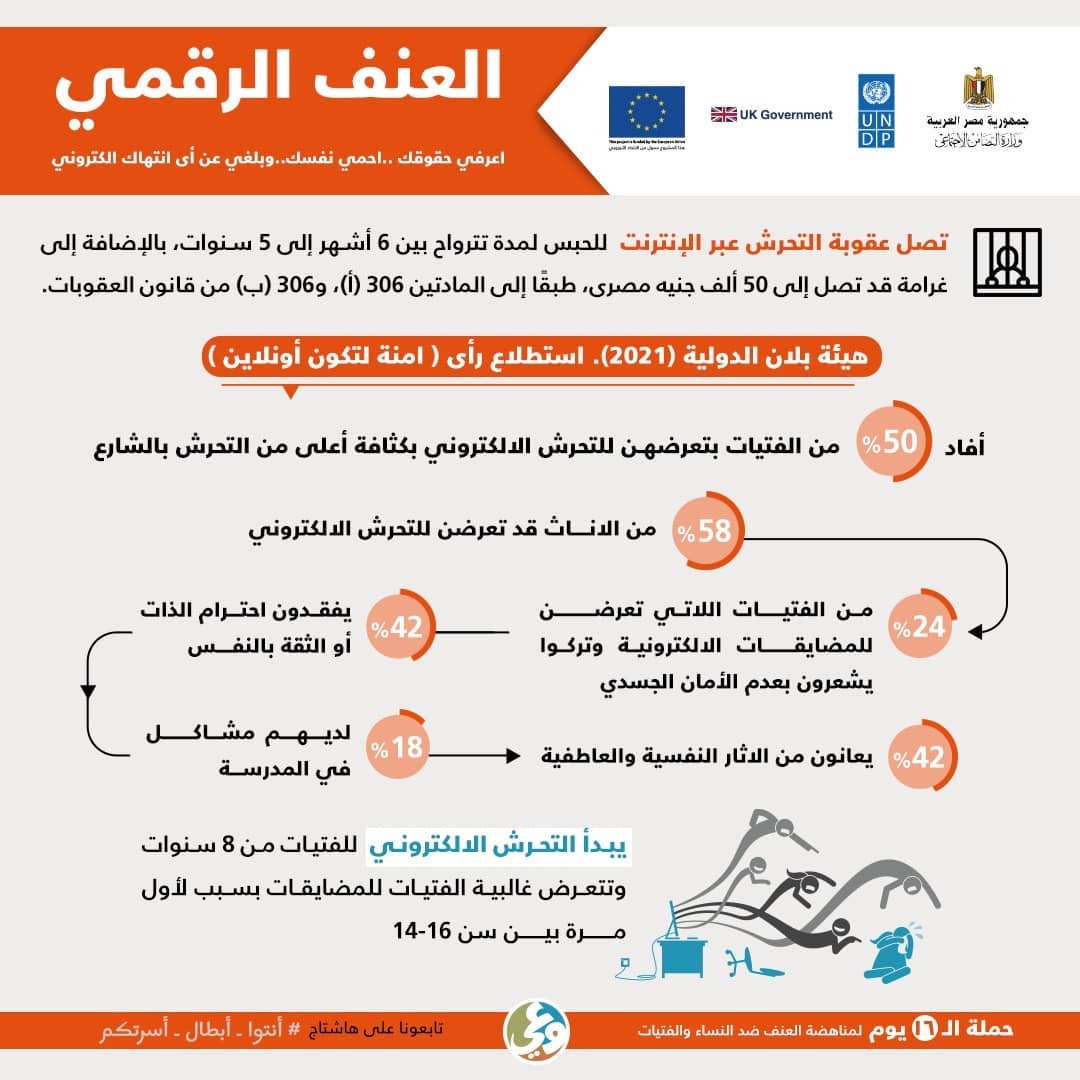 واستشهدت وزارة التضامن الاجتماعي، في منشور لها على صفحتها الرسمية على موقع التواصل الاجتماعي فيس بوك، باستطلاع رأي أجرته هيئة بلان الدولية، والذي أفاد بأن 58 % من الإناث في مصر تعرضن للتحرش الإلكتروني، ونحو 50 % من الفتيات يتعرضن للتحرش الإلكتروني بكثافة أعلى من الشارع، وحوالي 24 % من الفتيات اللاتي تعرضن للمضايقات الإلكترونية يشعرن بعدم الأمان الجسدي.