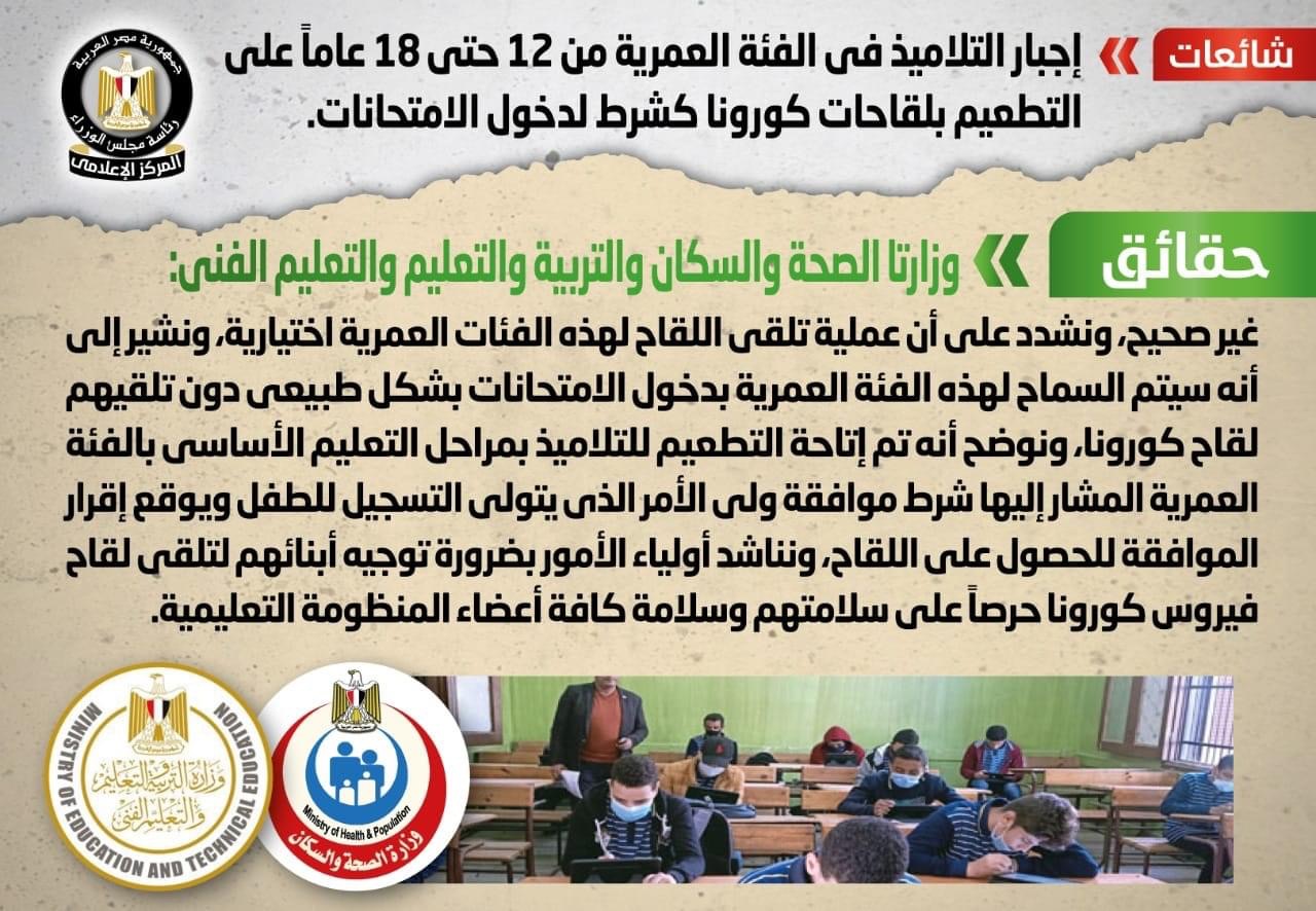 وقالت وزارتا الصحة والسكان والتربية والتعليم والتعليم الفني، إنه لا صحة لإجبار التلاميذ في الفئة العمرية من 12 حتى 18 عاما على التطعيم بلقاحات كورونا كشرط لدخول الامتحانات، وشددتا على أن عملية تلقي اللقاح لهذه الفئات العمرية اختيارية، وأشارتا إلى أنه سيتم السماح لهذه الفئة العمرية بدخول الامتحانات بشكل طبيعي دون تلقيهم لقاح كورونا، وأوضحتا أنه تم إتاحة التطعيم للتلاميذ بمراحل التعليم الأساسي بالفئة العمرية المشار إليها شرط موافقة ولي الأمر الذي يتولى التسجيل للطفل ويوقع إقرار الموافقة للحصول على اللقاح، وناشدتا أولياء الأمور بضرورة توجيه أبنائهم لتلقي لقاح فيروس كورونا حرصا على سلامتهم وسلامة كافة أعضاء المنظومة التعليمية.