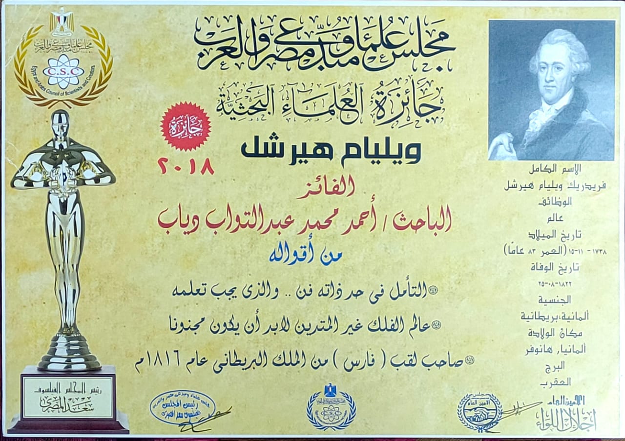 وفي عام 2017، نال جائزة التميز العلمي من وزير التعليم العالي، بالإضافة إلى جائزة ويليام هيرشل البريطانية عام 2018، ثم جائزة التفوق العلمي بعيد العلم 2019، وبعدها حصد جائزة التميز للأبحاث العلمية في عيد العلم عام 2020، كما تم الاستعانة بفكرته في مسلسل النهاية ليوسف الشريف 2020.