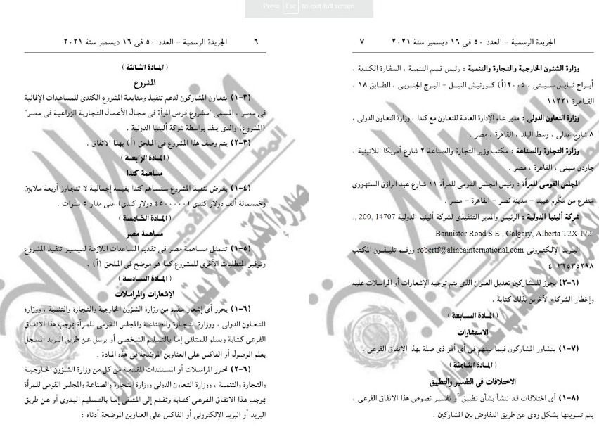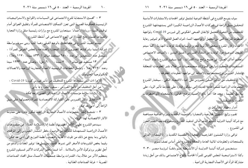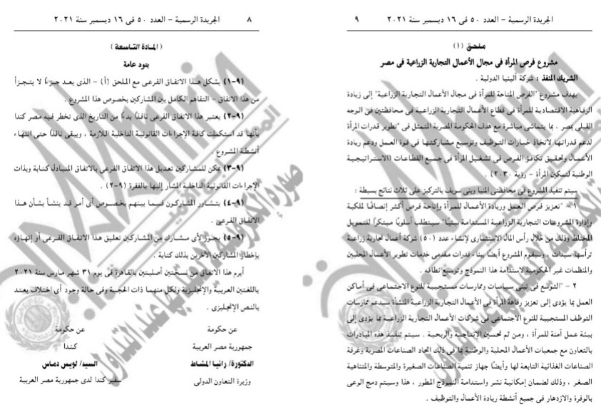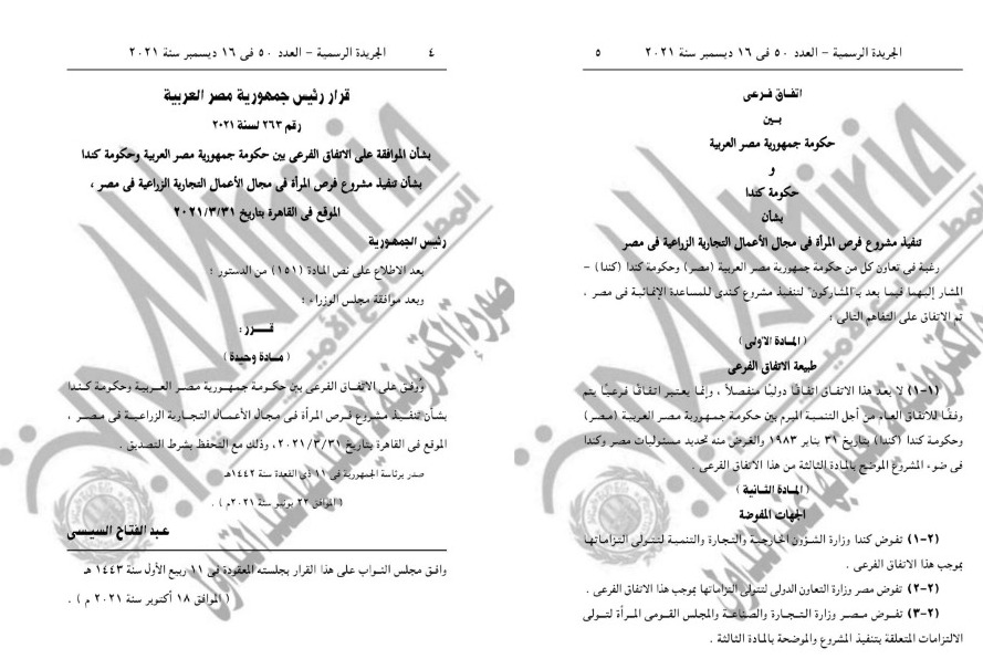 أصدر الرئيس عبد الفتاح السيسي، القرار رقم 263 لسنة 2021، بشأن الموافقة على الاتفاق الفرعي بين حكومة جمهورية مصر العربية وحكومة كندا، بشأن تنفيذ مشروع فرص المرأة في مجال الأعمال التجارية والزراعية في مصر، والموقع في القاهرة بتاريخ 31 مارس 2021.