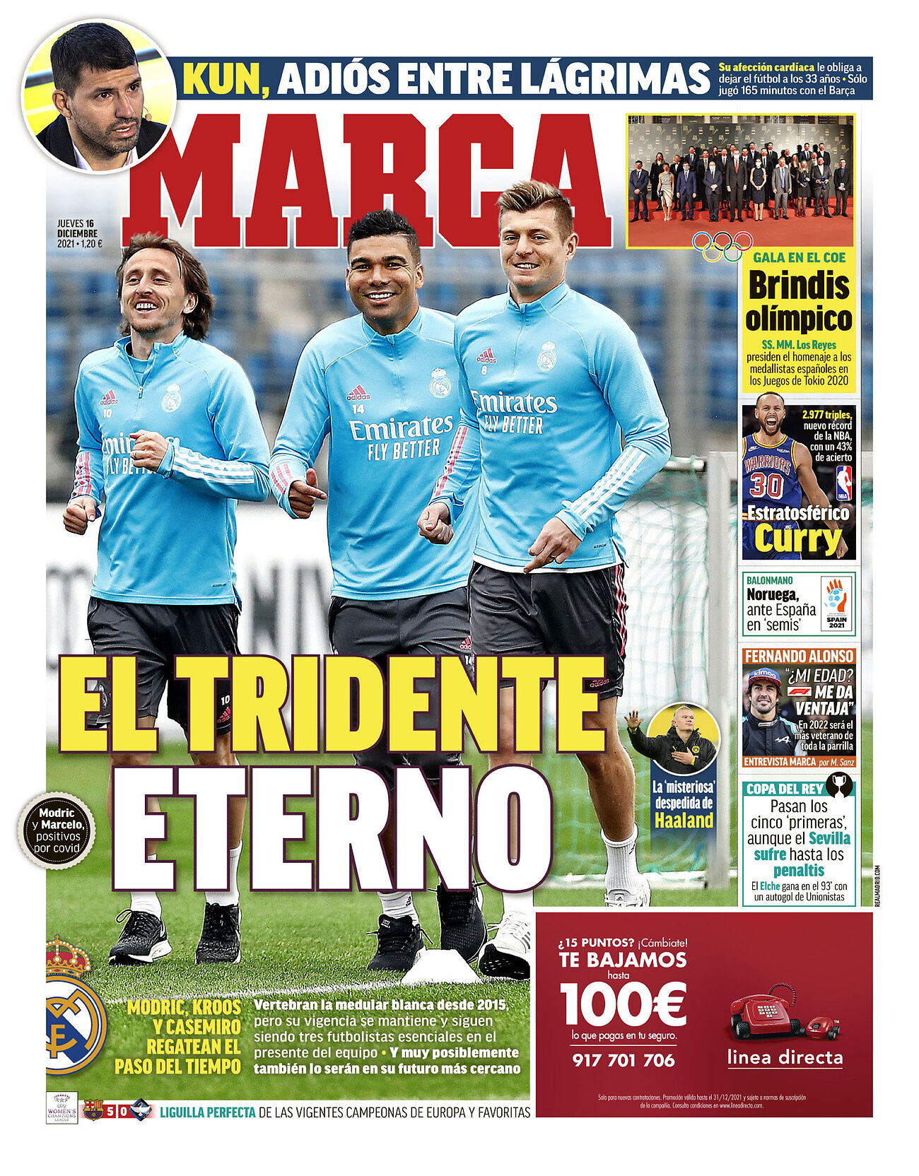 عنونت ماركا في غلافها الصادر عن عدد اليوم الخميس بـ رمح ثلاثي الشعب الأبدي.. مودريتش وكروس وكاسيميرو يساومون بمرور الوقت، في إشارة بأن الثلاثي لا غنى عنهم في تشكيل ريال مدريد منذ 2015.