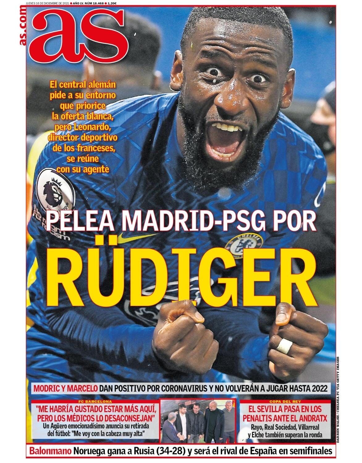 تصدر قتال ريال مدريد وباريس من أجل روديجر غلاف صحيفة آس الإسبانية، حيث أكدت الصحيفة أن المدافع الألماني من المقربين منه إعطاء الأولوية للعرض الأبيض، لكن ليوناردو المدير الرياضي لباريس سان جيرمان، يلتقي بوكيله.