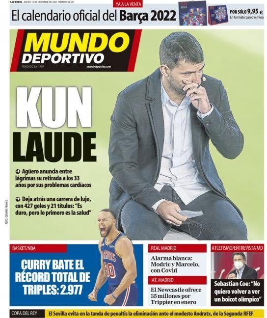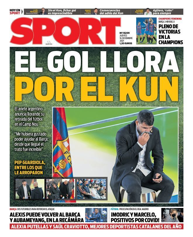 سلطت سبورت الضوء، في غلافها على اعتزال أجويرو، وعرضت لحظة بكائه في أثناء إعلانه اعتزال كرة القدم أمس في مؤتمر صحفي أقيم في نادي برشلونة الإسباني.