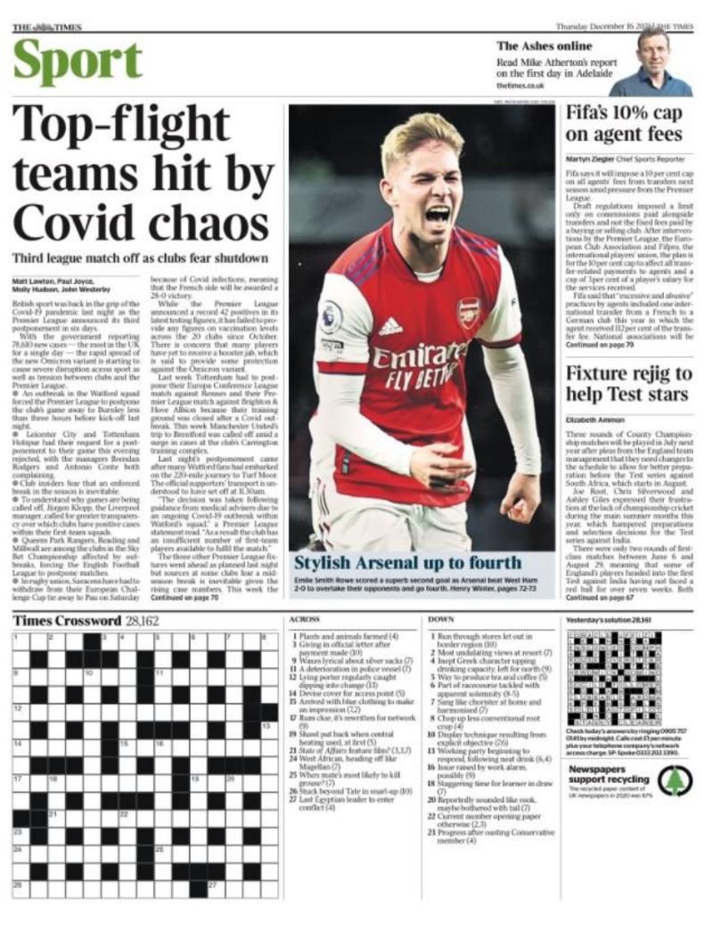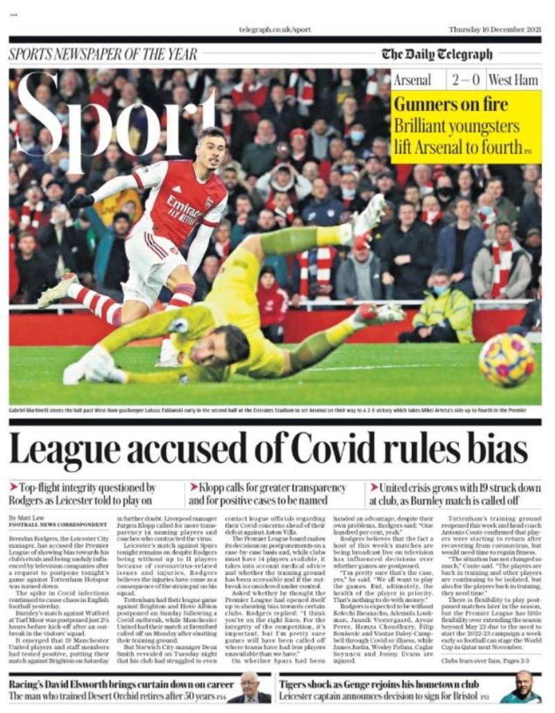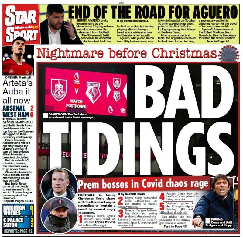 تصدر العنوان كابوس ما قبل الكريسماس غلاف صحيفة ديلي ستار الإنجليزية لعدد اليوم، وذلك مع إشارة من جانب الصحيفة بأن هناك قلق كبير في البريميرليج وإنجلترا بسبب تفشي كورونا.