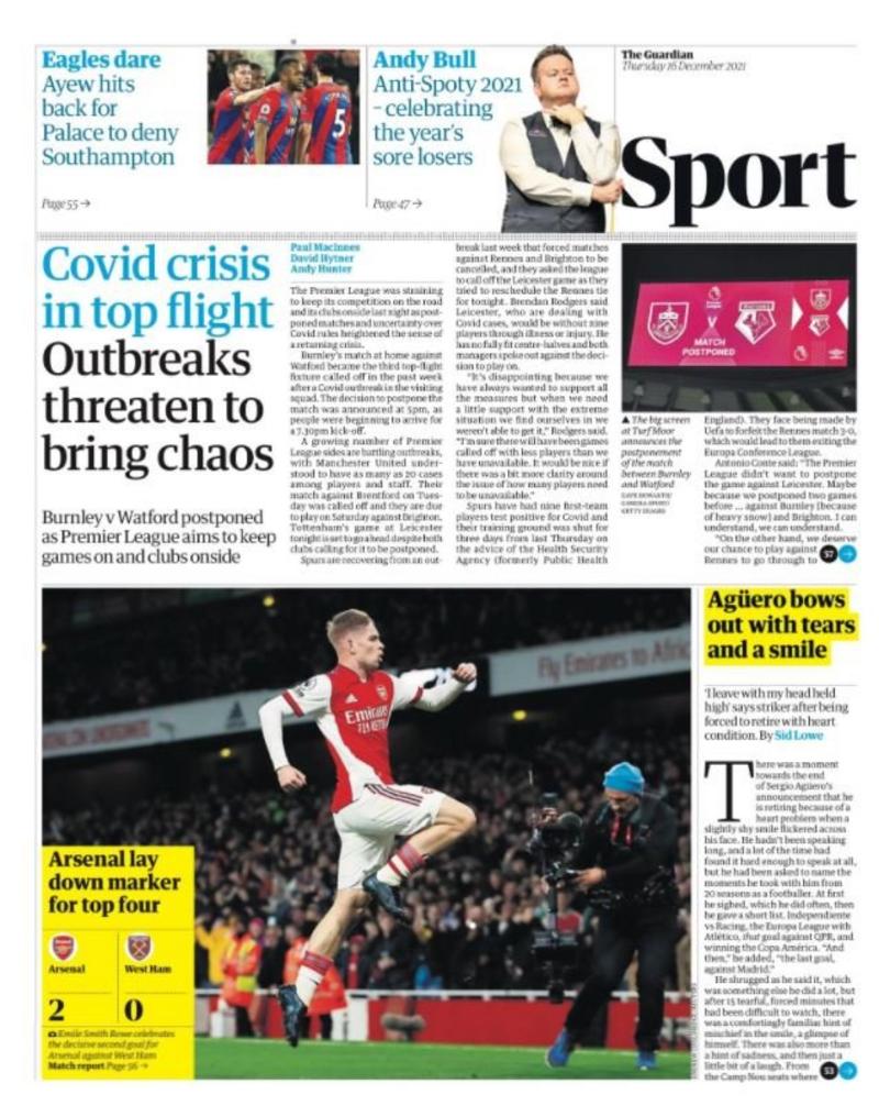 عنونت جارديان في غلافها بـ حالات كورونا بين الكبار في السماء، مطاردة كبيرة وفوضى بسبب الفيروس، بعد أن سجل مانشستر يونايتد 19 حالة إصابة وبرينتفورد 13 أخرى بجانب تواجد حالات عديدة في أندية مختلفة.