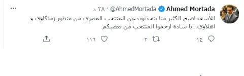وكتب أحمد مرتضى عبر صفحته على تويتر قائلا: للأسف أصبح الكثير منا يتحدثون عن المنتخب المصري من منظور زملكاوي وأهلاوي… يا سادة ارحموا المنتخب من تعصبكم.