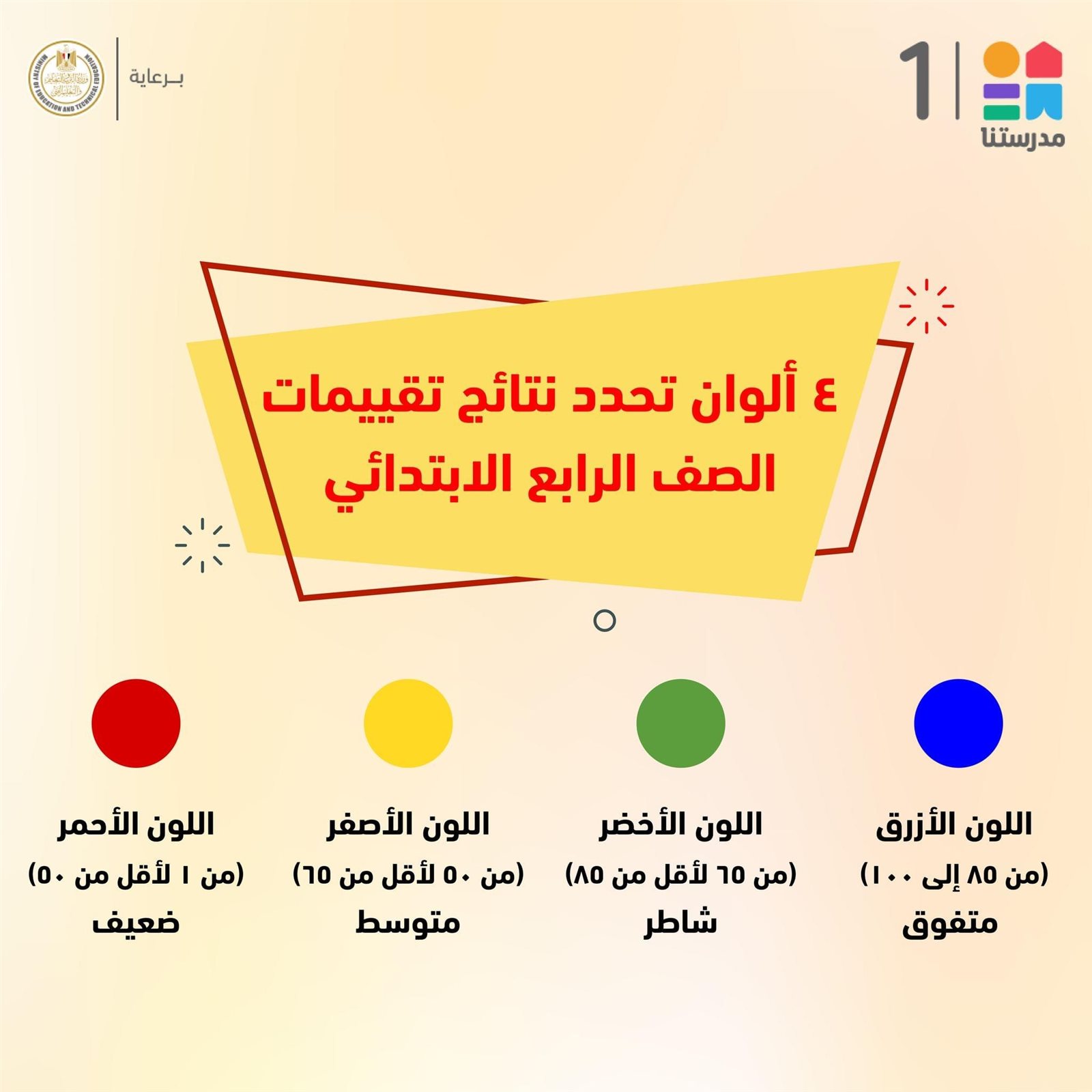 أبرزت قناة مدرستنا للمرحلة الابتدائية، عبر صفحتها على موقع التواصل الاجتماعي فيس بوك، لطلاب وأولياء أمور الصف الرابع الابتدائي، طريقة تقييم أداء ومستويات الطلاب.