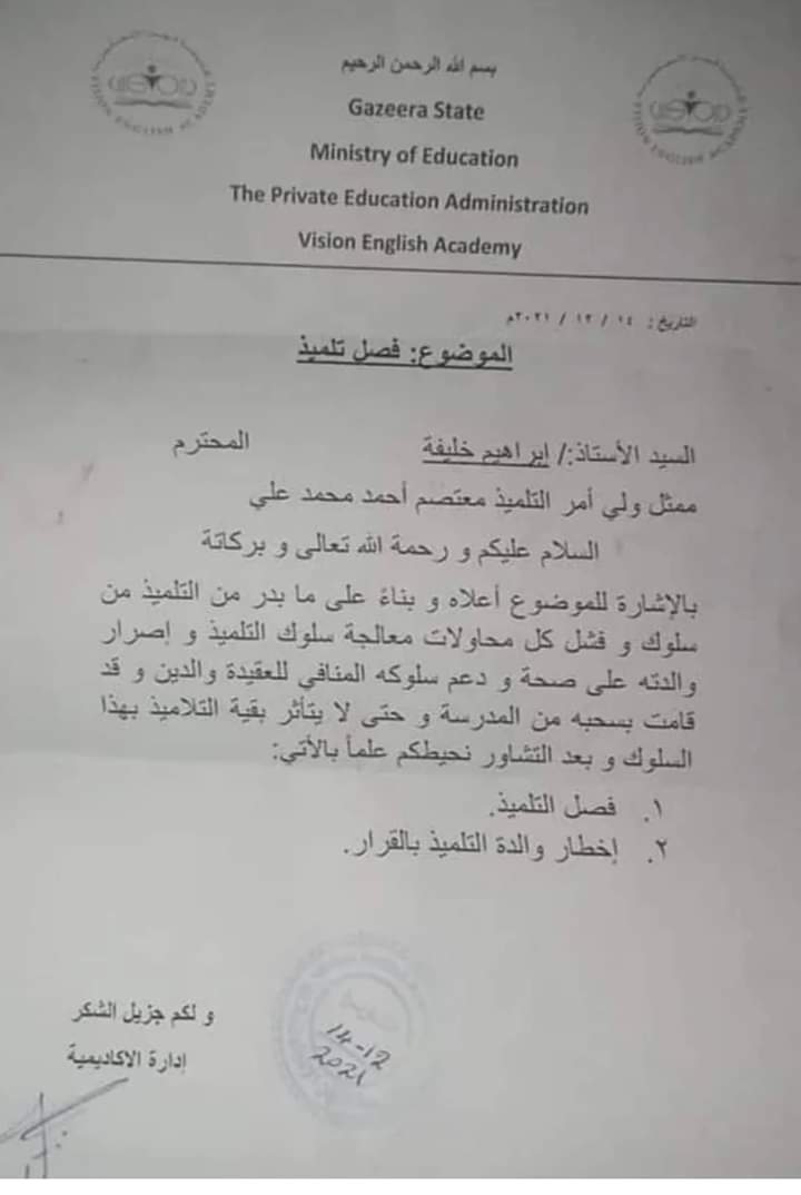 شهدت مواقع التواصل الاجتماعي، حالة كبيرة من الجدل خلال الساعات الماضية بعد تداول عدد من المستخدمين مستند يعود لإحدى الحضانات في ولاية الجزيرة السودانية يتعلق بفصل أحد الأطفال من بسبب سلوكه المنافي للعقيدة والدين على حد وصف مسئولي الحضانة.