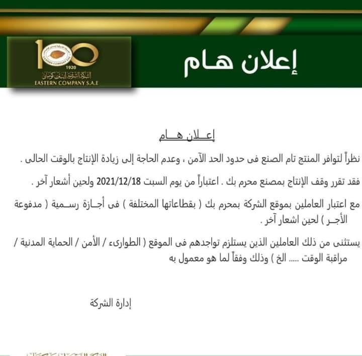 وأضافت الشركة الشرقية للدخان، في بيان لها، أنه سيتم تطبيق القرار اعتبارا من غدا السبت 18 ديسمبر 2021، مع اعتبار العاملين بموقع الشركة بمحرم بك وقطاعاتها المختلفة، في إجازة رسمية مدفوعة الأجر لحين إشعار آخر.