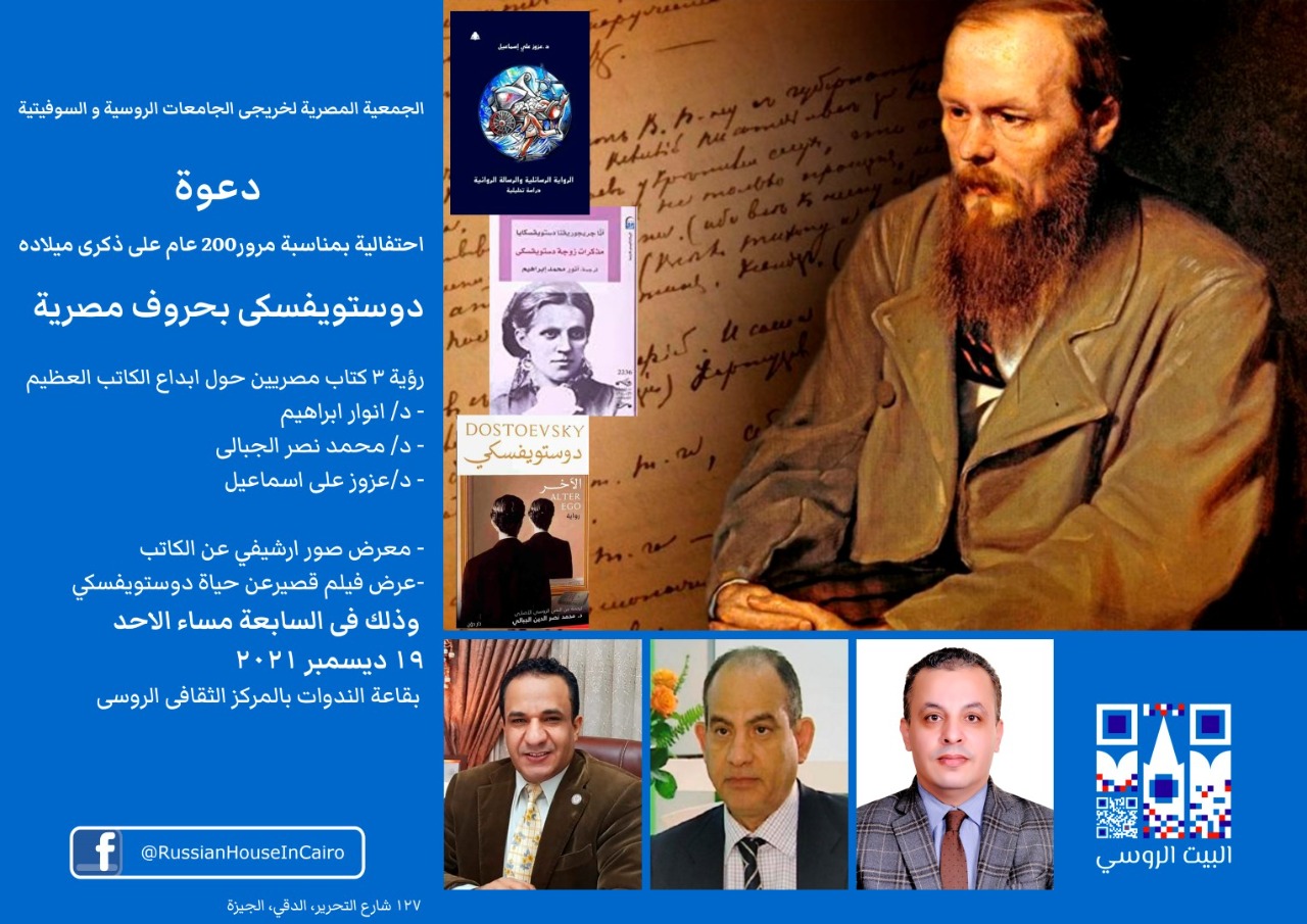 تنظم الجمعية المصرية لخريجي الجامعات الروسية والسوفيتية احتفالية بعنوان دوستويفسكي بحروف مصرية، بمناسبة مرور 200 عام على ذكرى ميلاده، وذلك فى السابعة مساء اليوم الأحد 19 ديسمبر الجاري بقاعة الندوات بالمركز الثقافى الروسي بالدقى.