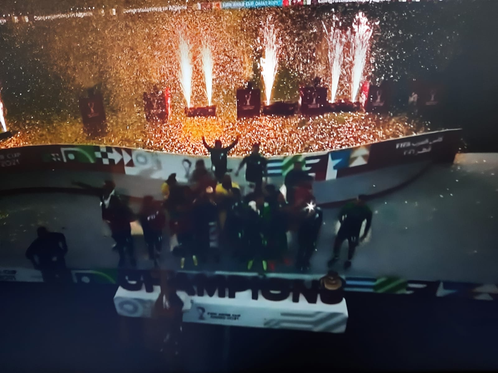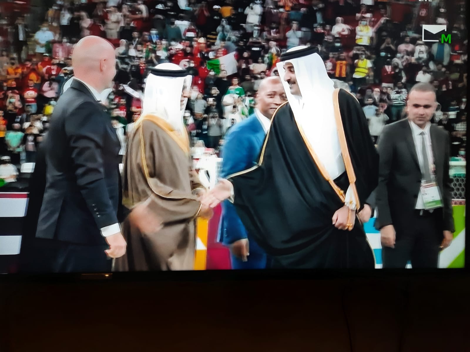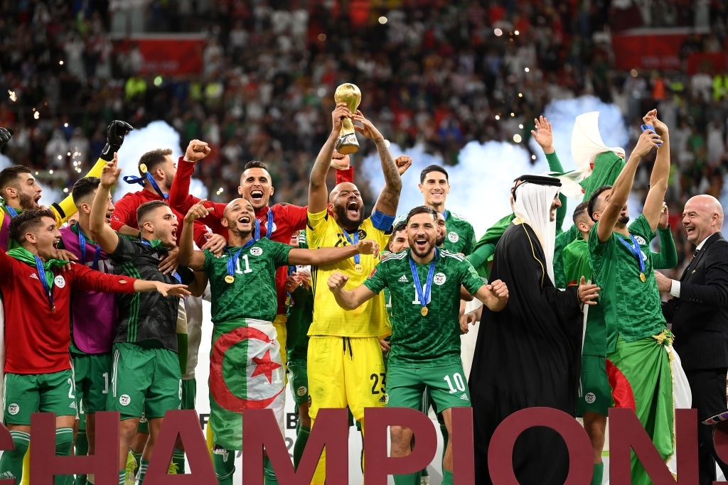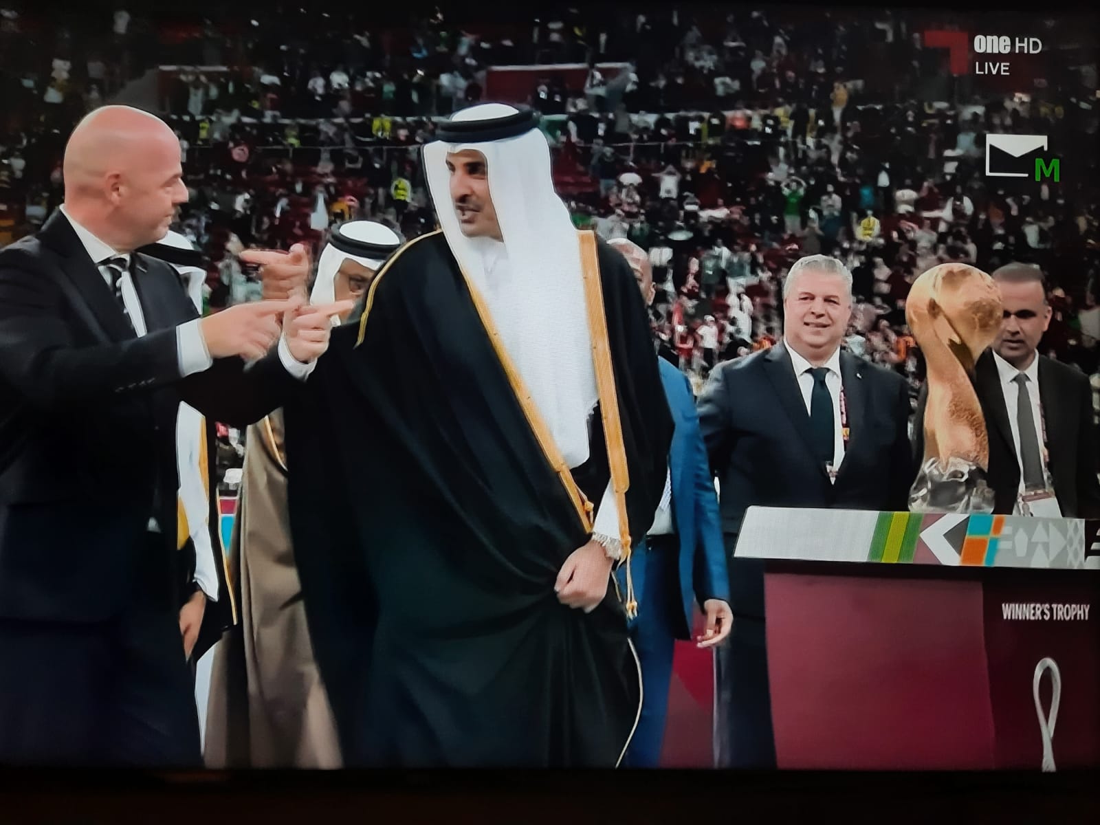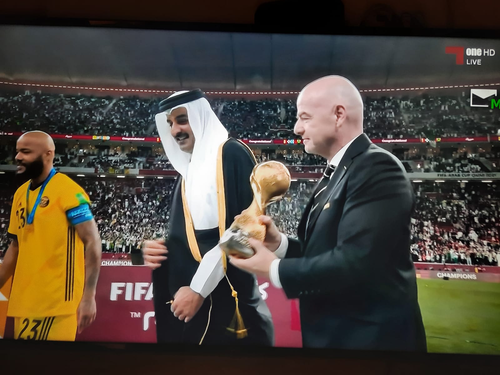 وسلم الكأس والميداليات الذهبية لمنتخب الجزائري، الأمير تميم بن حمد آل ثاني أمير قطر، بالإضافة إلى السويسري جياني إنفانتينو رئيس الاتحاد الدولي لكرة القدم.