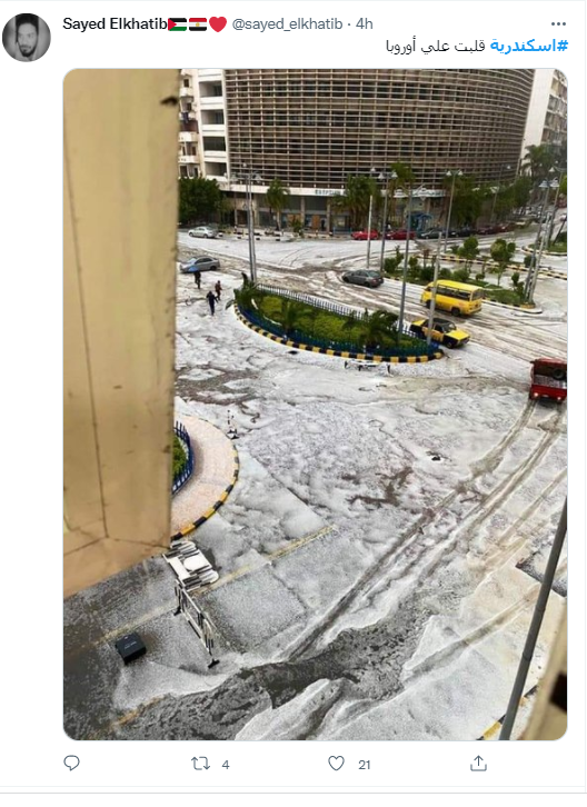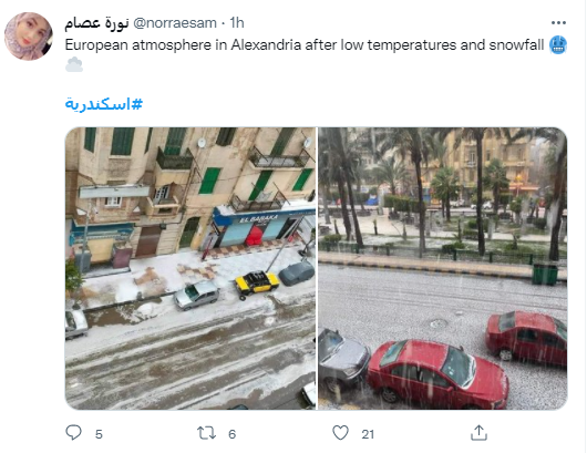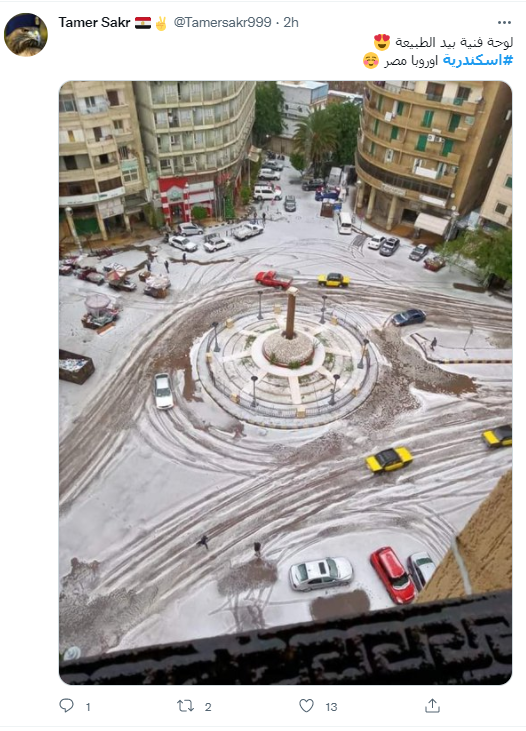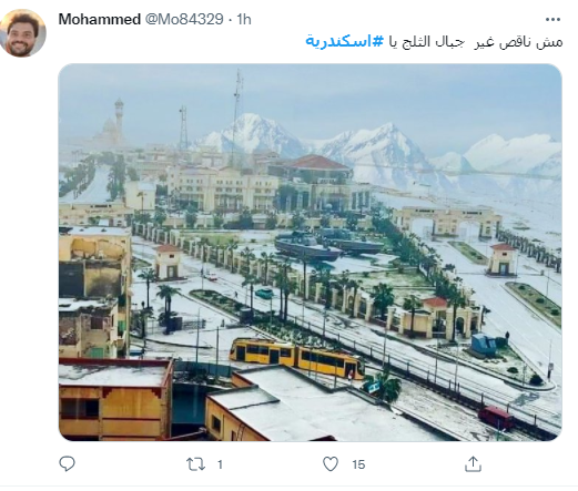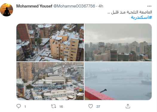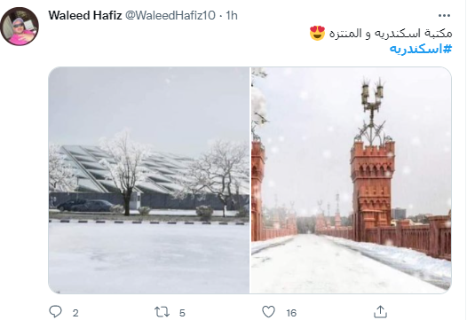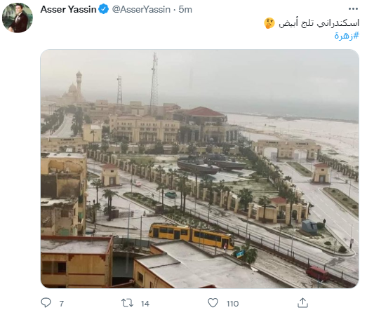 ونشر الفنان آسر ياسين، صورة لمحافظة الإسكندرية، خلال سقوط الثلوج، عبر حسابه الخاص على تويتر، معلقًا عليها: إسكندراني تلج أبيض.. زهرة.
