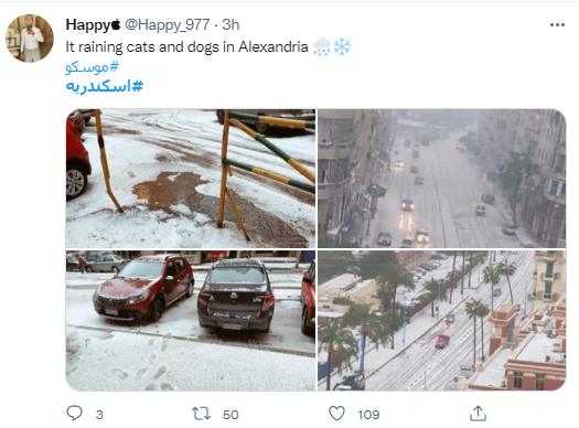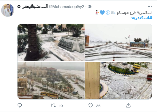 كما نشر محمد يوسف، مجموعة صور لها، قائلًا: العاصفة الثلجية منذ قليل، وعلق حساب آخر: اسكندرية فرع موسكو، فيما قال سيد الخطيب: إسكندرية قلبت على أوروبا.