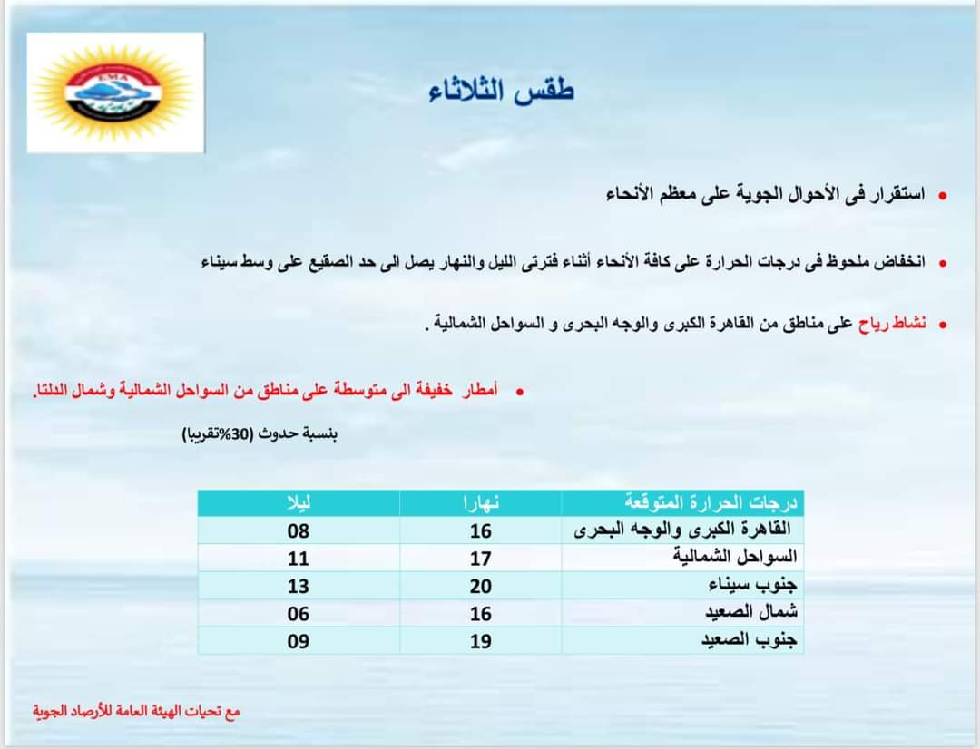 وتتوقع هيئة الأرصاد الجوية سقوط أمطار خفيفة إلى متوسطة على مناطق متفرقة من السواحل الشمالية وشمال الدلتا، إلى جانب نشاط رياح على مناطق من القاهرة الكبرى والسواحل الشمالية ومحافظات الوجه البحري.