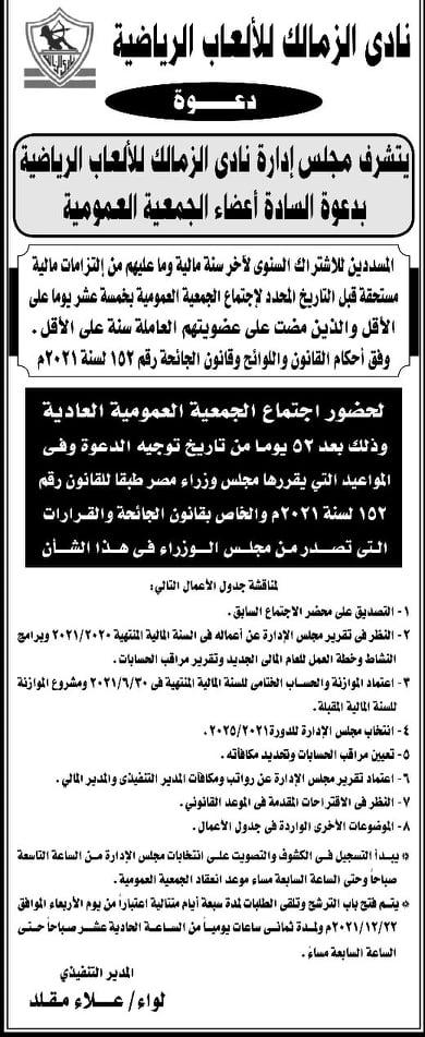 وقال مجلس الإدارة إن الجمعية العمومية ستنعقد بعد 52 يوما من تاريخ توجيه الدعوة وفي المواعيد التي يقرها مجلس وزراء مصر طبقا للقانون رقم 152 لسنة 2021، والخاص بقانون الجائحة والقرارات التي تصدر من مجلس الوزراء بهذا الشأن.