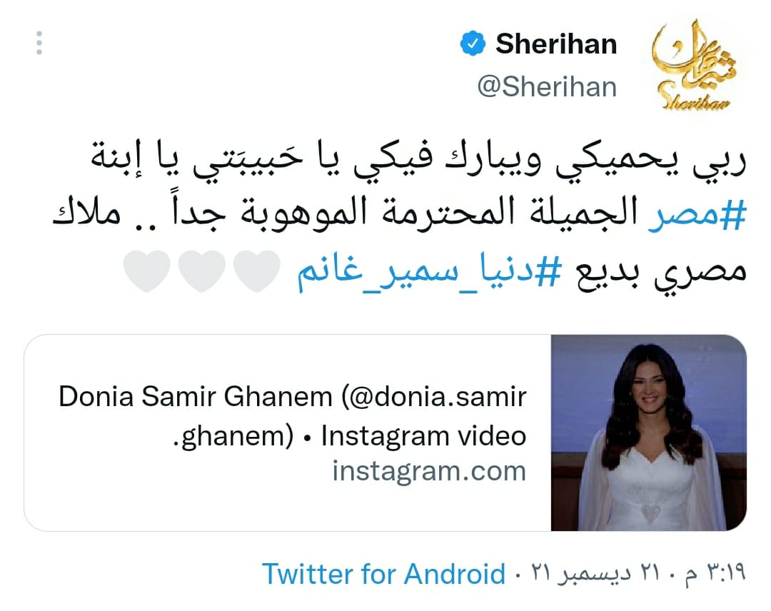 وكتبت شريهان تغريدة، عبر حسابها الشخصي بموقع التدوينات القصيرة تويتر، مغردةً: ربي يحميكي ويبارك فيكي يا حبيبتي.. ابنة مصر الجميلة المحترمة الموهوبة جدًا، ملاك مصري بديع.