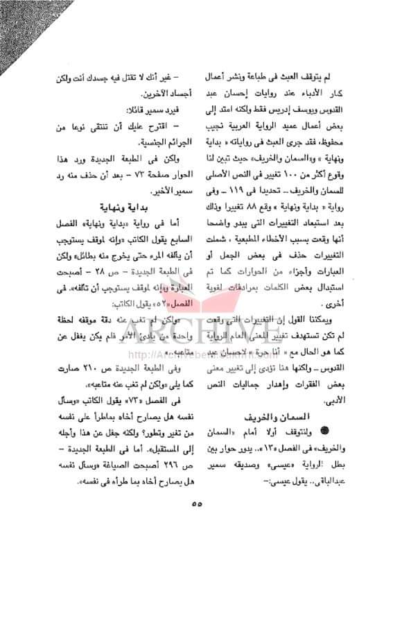 وكشف النمنم، أهم أعمال نجيب محفوظ التي طالها التغيير، ومنها 149 تغييرا على رواية السمان والخريف و88 تغييرا في رواية بداية ونهاية، مؤكدا أن التغييرات شملت حذف بعض الجمل وأجزاء من الحوارات واستبدال بعض الكلمات بمرادفات لغوية أخرى، ما أدى إلى إهدار جماليات النص الأدبي.