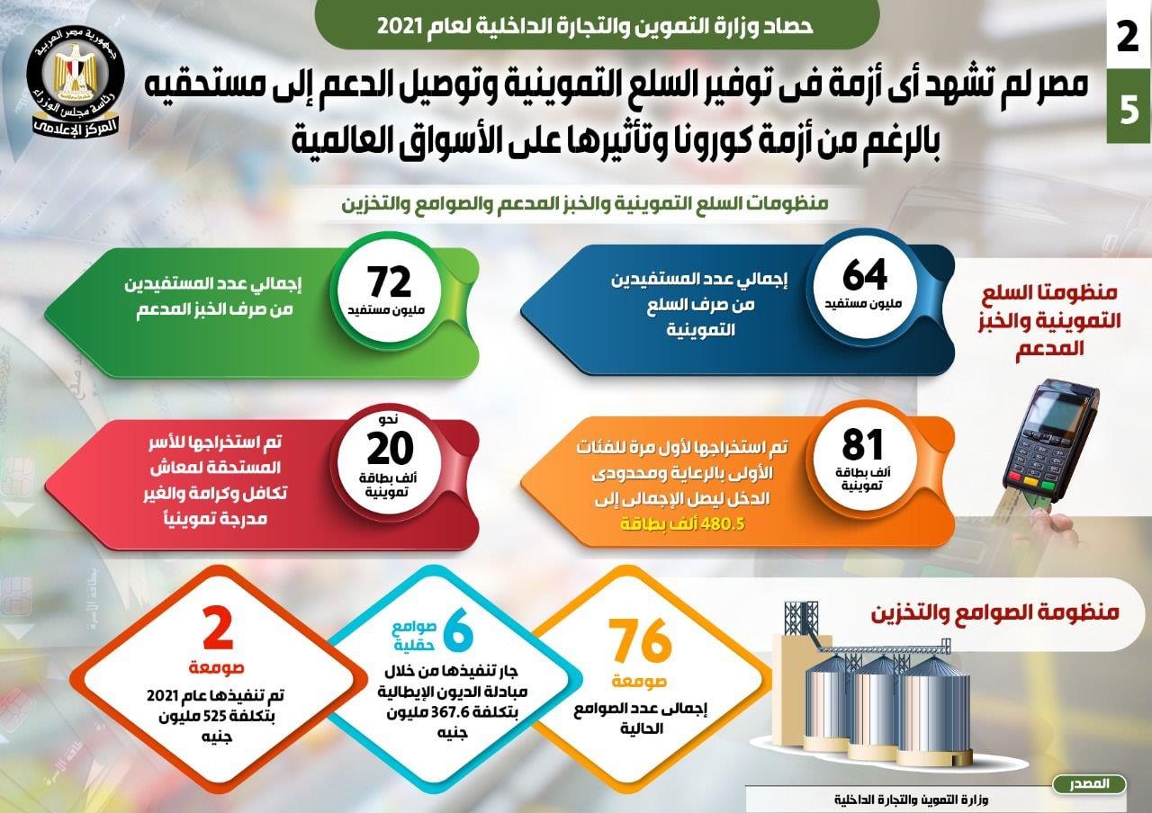 وشهدت مصر في تلك الفترة إنجازات كبرى في ملف التموين ، بداية من رغيف الخبز مرورًا بالاكتفاء الذاتي للكثير من السلع الاستهلاكية، حيث سيصل محصول القمح إلى الاكتفاء يزيد عن عامين.