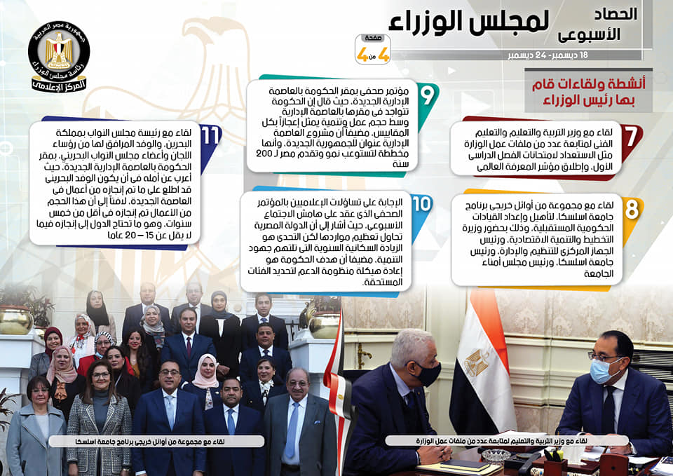 نشر المركز الإعلامي لمجلس الوزراء، تقريرًا شمل إنفوجرافات سلط من خلالها الضوء على الحصاد الأسبوعي لمجلس الوزراء، وذلك خلال الفترة من 18 حتى 24 ديسمبر 2021، والذي تضمن الاجتماعات واللقاءات التي عقدها الدكتور مصطفى مدبولي، رئيس مجلس الوزراء، بالإضافة إلى ما أجراه من أنشطة.